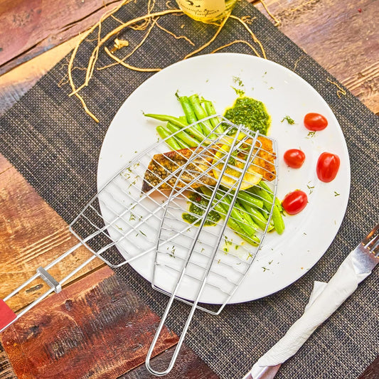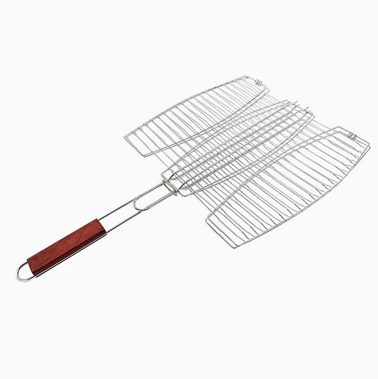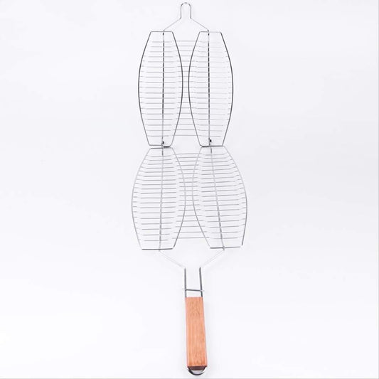 2 Fishes BBQ Grill Basket Wire Mesh Grilling Net with Long Wooden Handle