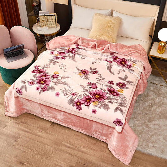 10 LB Korean Heavy Plush 2 Ply Mink Blankets with Pink Floral Pattern Queen-Sized