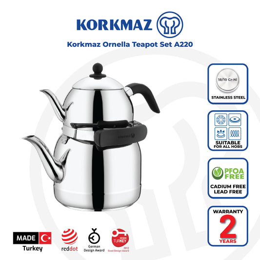 Korkmaz Nostaljia Midi Stainless Steel 0.9 Liter Tea Pot and 1.6 Liter Kettle Set