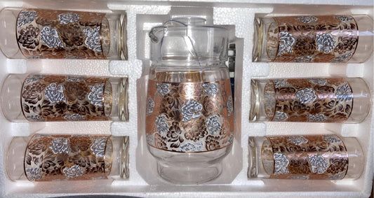 7 PC Rose Gold Peony Design Set with Glass Pitcher and Cups