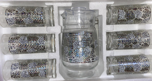 7 PC Silver And Black Peacock Tail Design Set with Glass Pitcher and Cups
