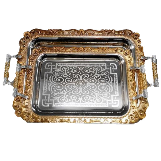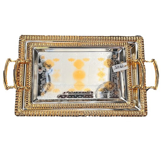 2 PC Turkish Serving Tea Tray Set Gold Handle and Accents Chrome Plated