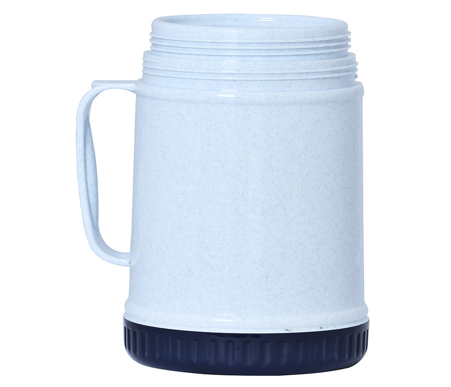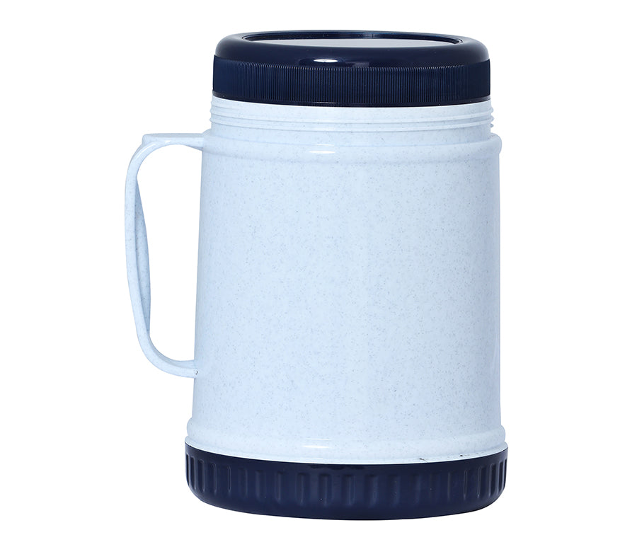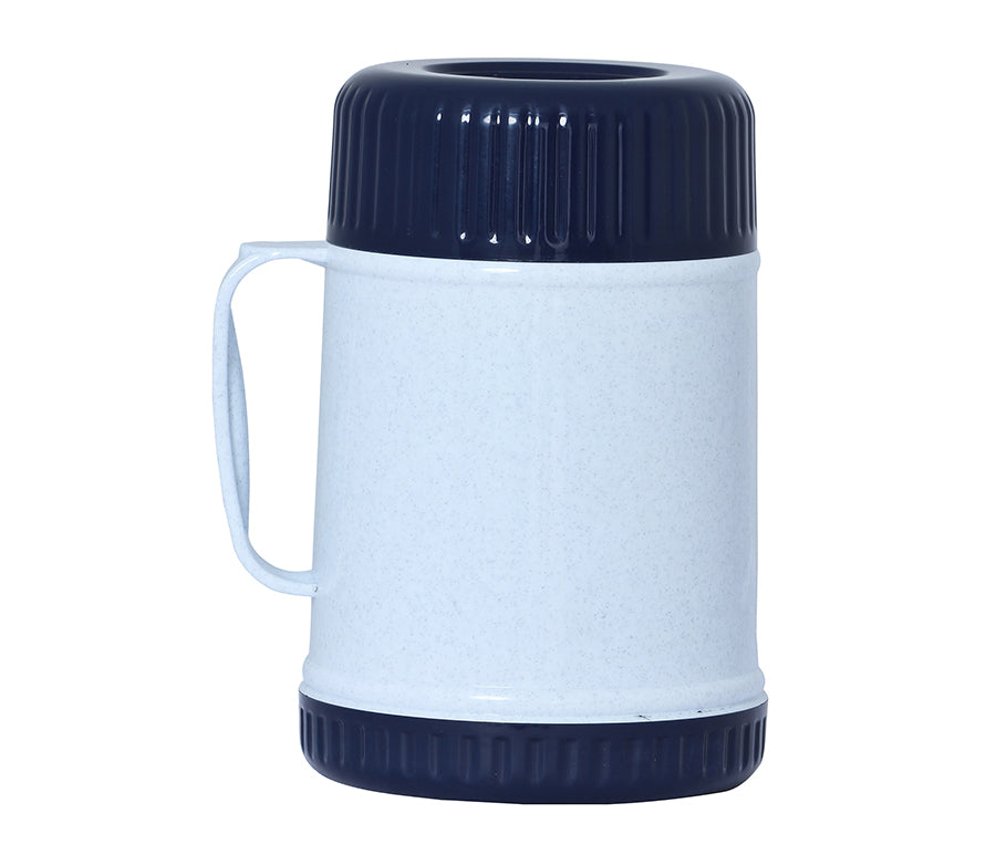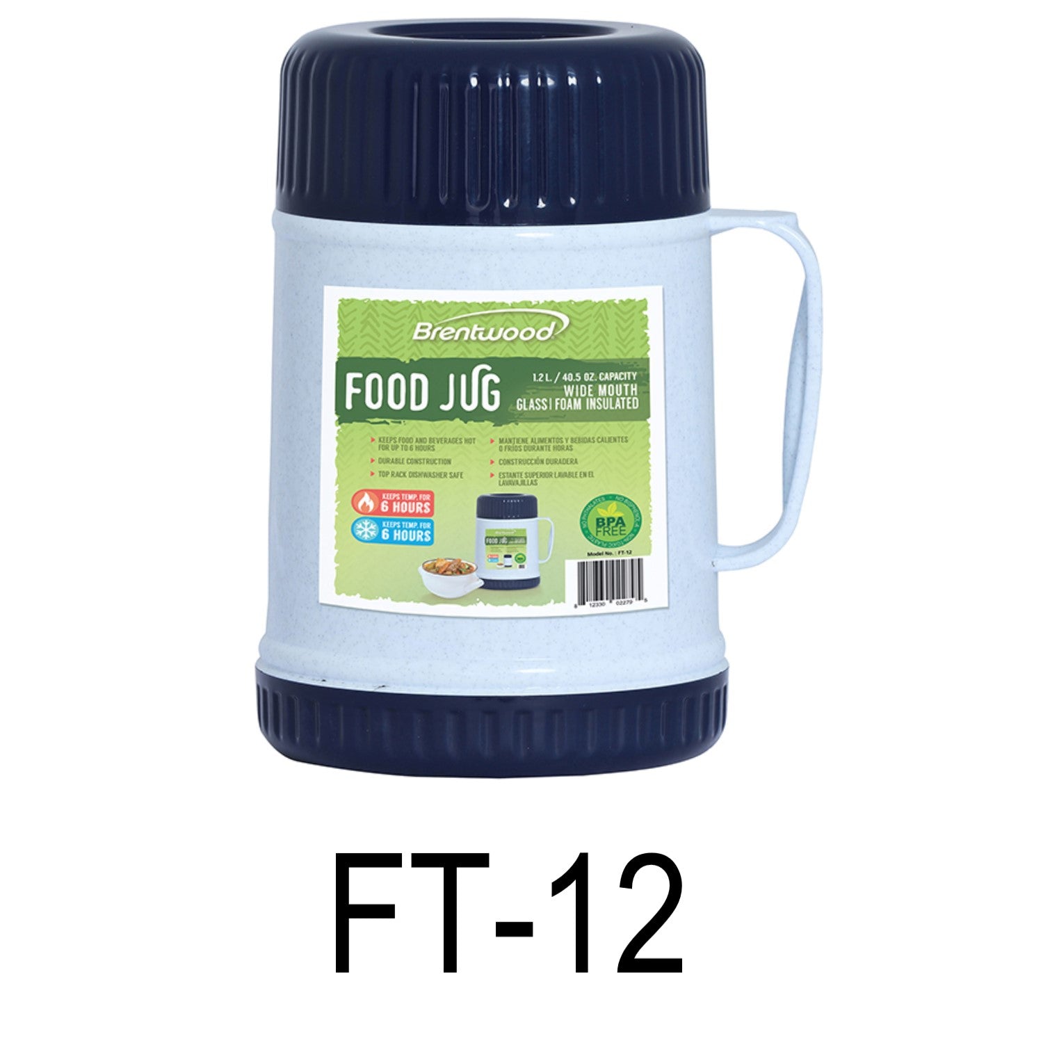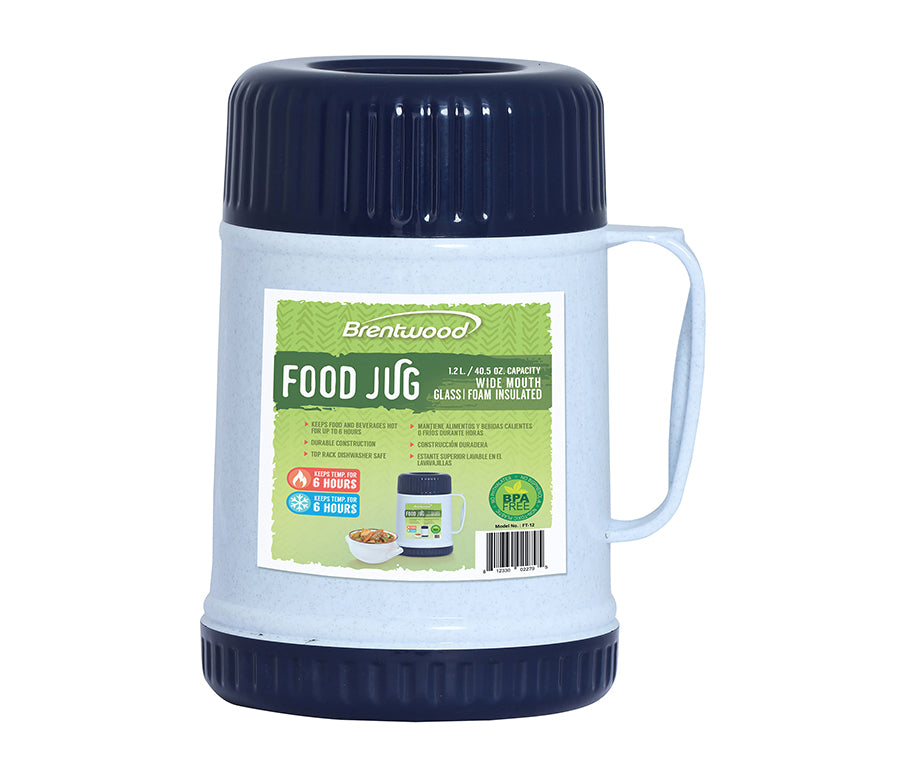- The BPA Free Brentwood FT-12 40oz Wide Mouth Food Jar keeps food and drinks hot or cold for up to 6 hours. Features a 2in1 lid and bowl, cool touch, sweat free body, and large ergonomic carry handle. Stylish 2 tone blue and white thermos is perfect for travel, work, school and more.