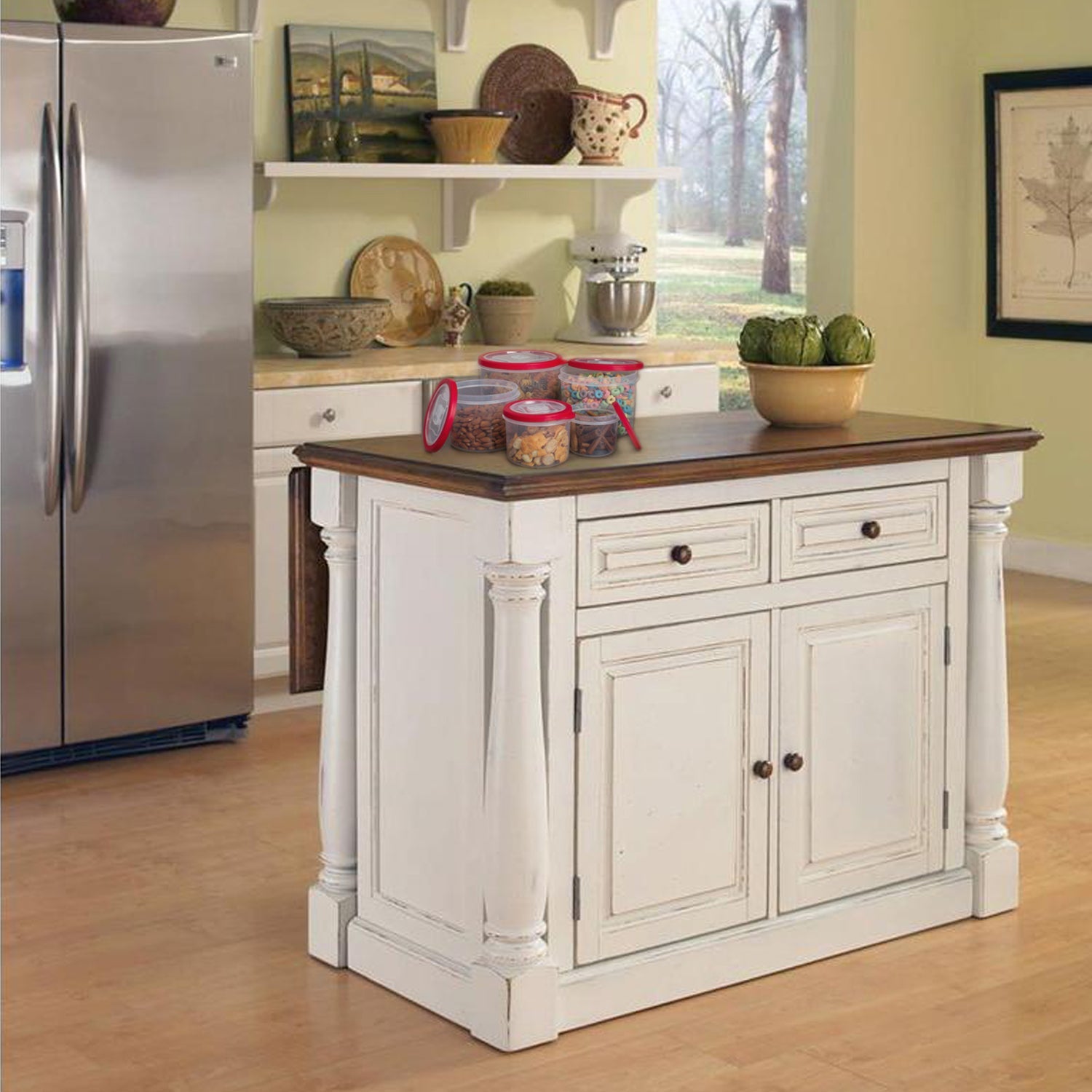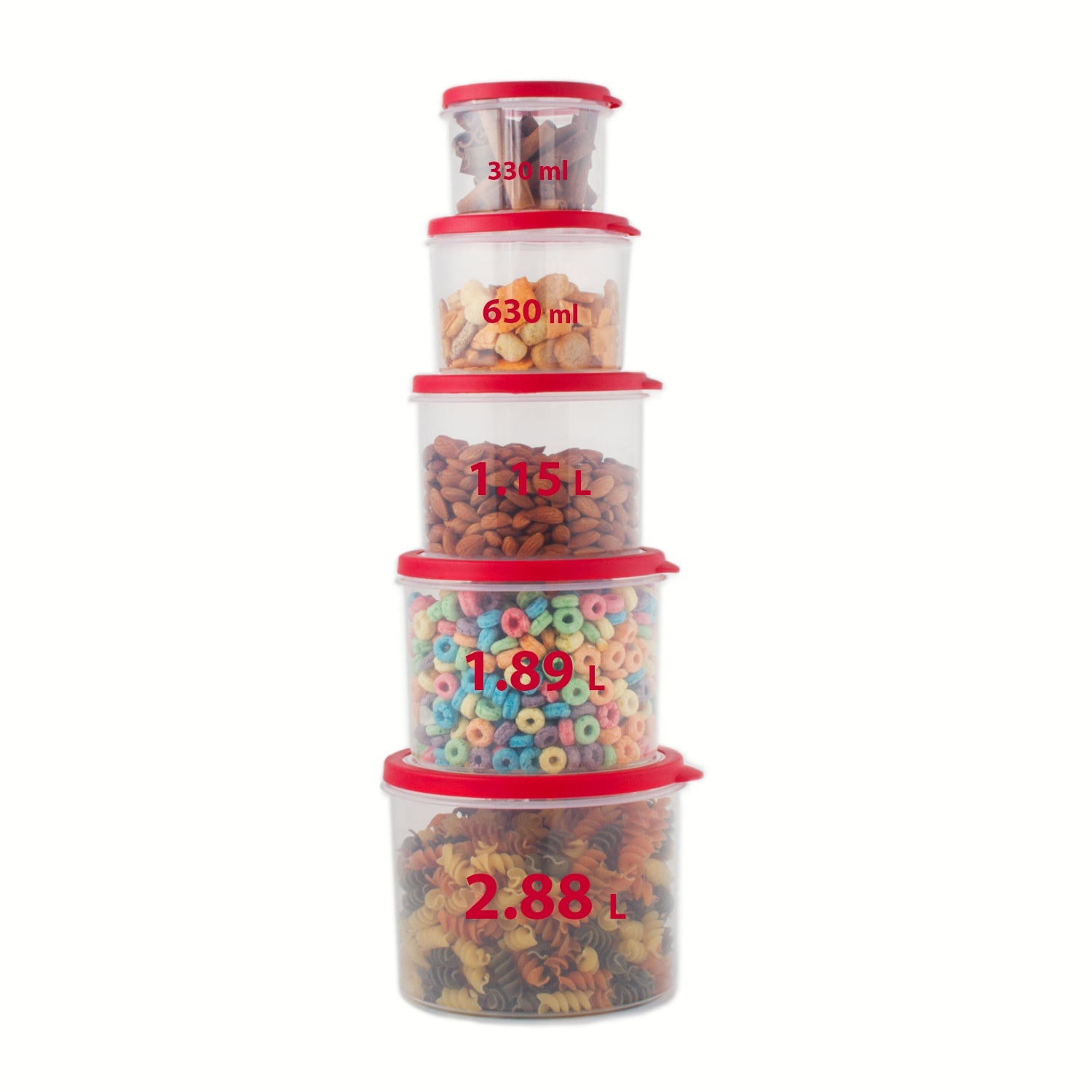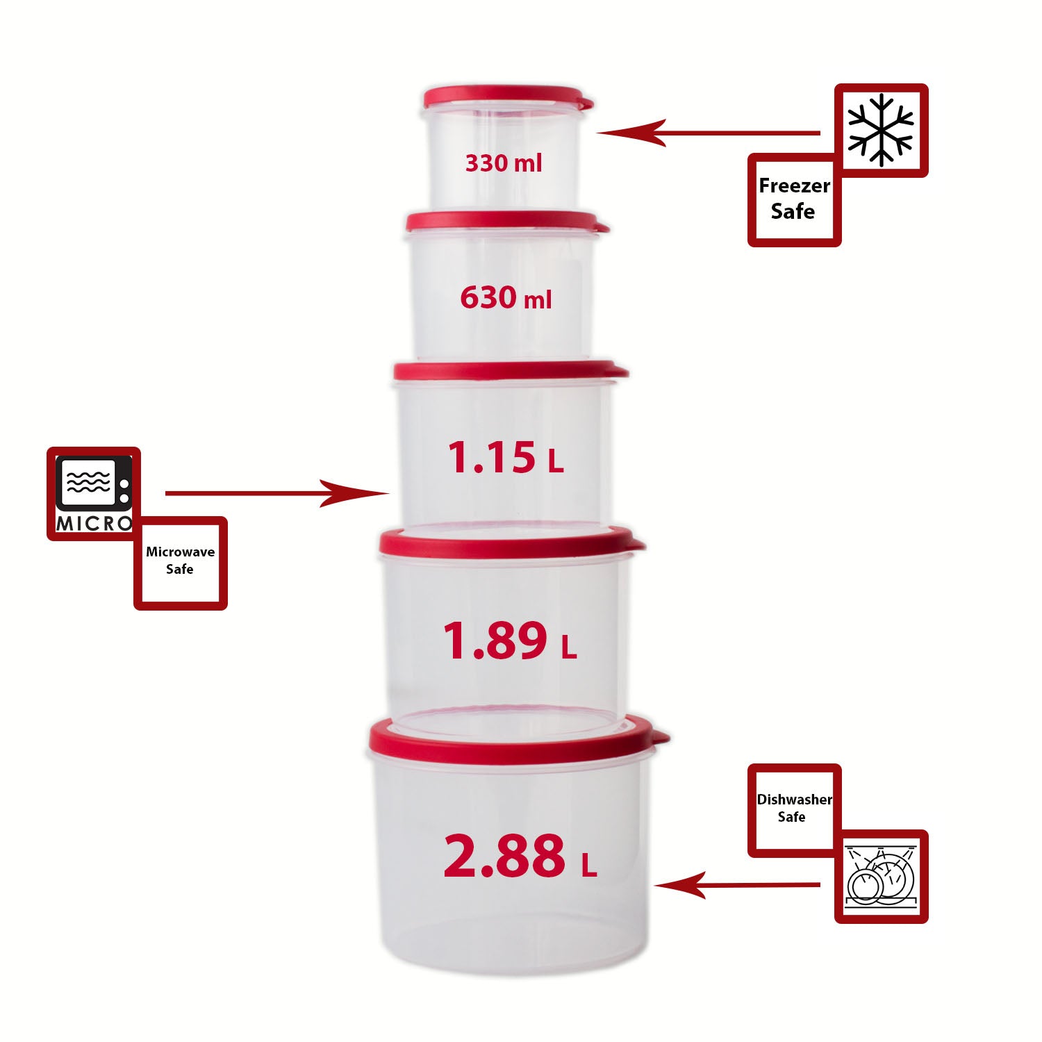 Keeping your food fresh and your cupboards clean is made easy with this time saving 10-piece food storage container set. The set is composed of 5 durable plastic food storage containers and 5 red lids that will keep your food secure and fresh. The containers and lids are made up of easy to clean high-quality plastic that is BPA free. The volume of the five containers vary in size: 350ml, 650ml, 1.1 liter, 1.65 liter and 2.4 liters. This food storage container set is great for organization, the grooves in the lids allow the containers to securely stack upon each other, creating a nesting affect. This helps save space, and gives them a sleek look in the cabinet or fridge. All the lids are airtight and come with pop-open vents for safe microwave usage. The containers are also dishwasher and freezer safe.