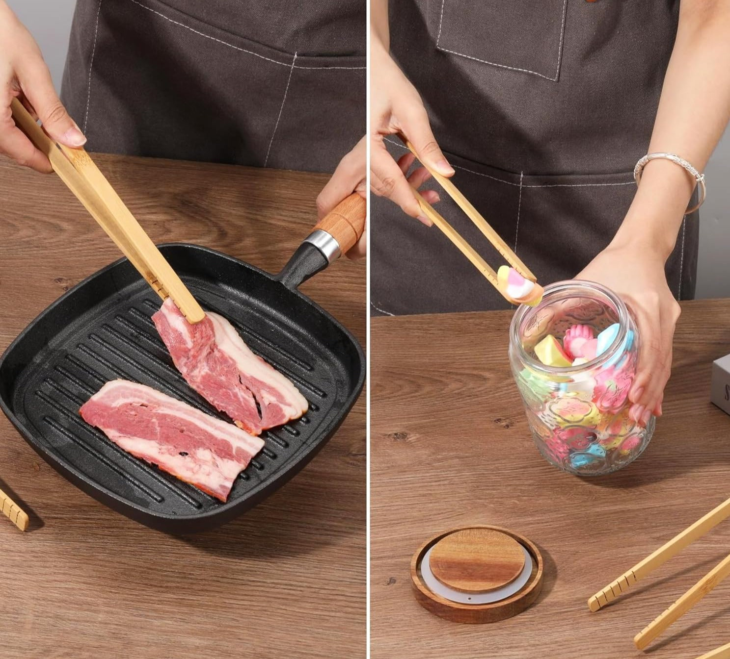 - MULTI PURPOSE The 8 Inch Length is the perfect length, its long enough to keep you away from the heat as well as not too long to be clumsy and uncomfortable as other wooden tongs on the market. In addition to traditional uses the Tongs are great for serving sweets in the parties or even valid substitute for chopstick they can be used to grab hard to reach goods. They Also can be a perfect GIFT IDEA.