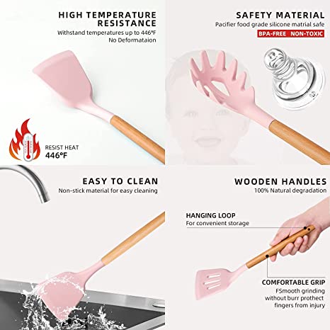 - FEATURES- Our Silicone Kitchen Utensils are made up of food-grade silicone, heat-resistant materials, and very safe to use in any type of food. This Kitchenware can withstand up to 446°F temperature and also it will not retain any odors or colors.