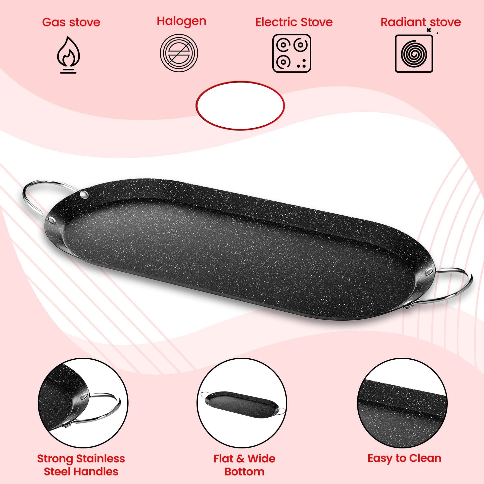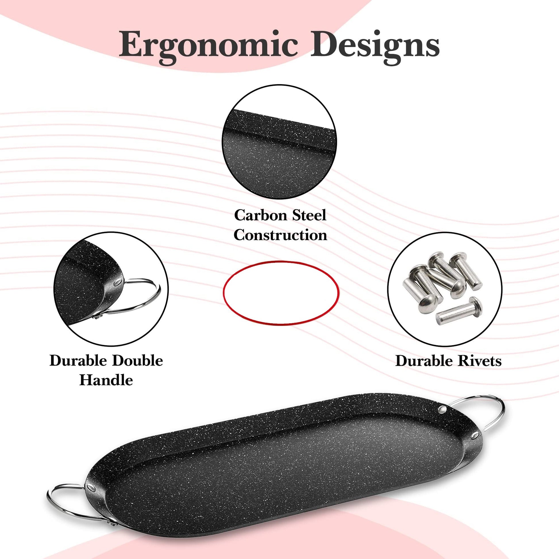 - EASY TO USE: Unlike similar accessories, our kitchen Comal griddle nonstick has a riveted side Double handle that is easy to use and durable, which allows you to maneuver this Mexican Comal with ease. The gauge reaches very high temperatures much more easily than other pans, so it is recommended that you cook using low to medium heat.
