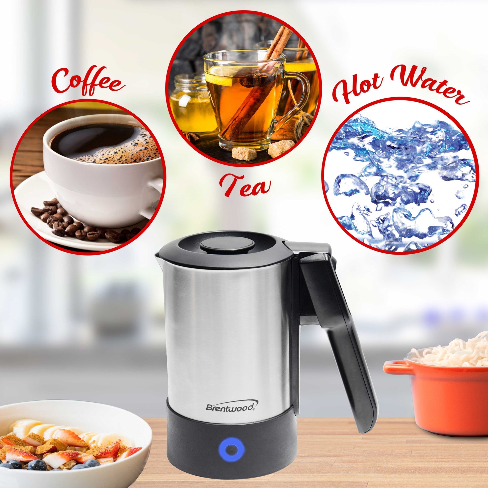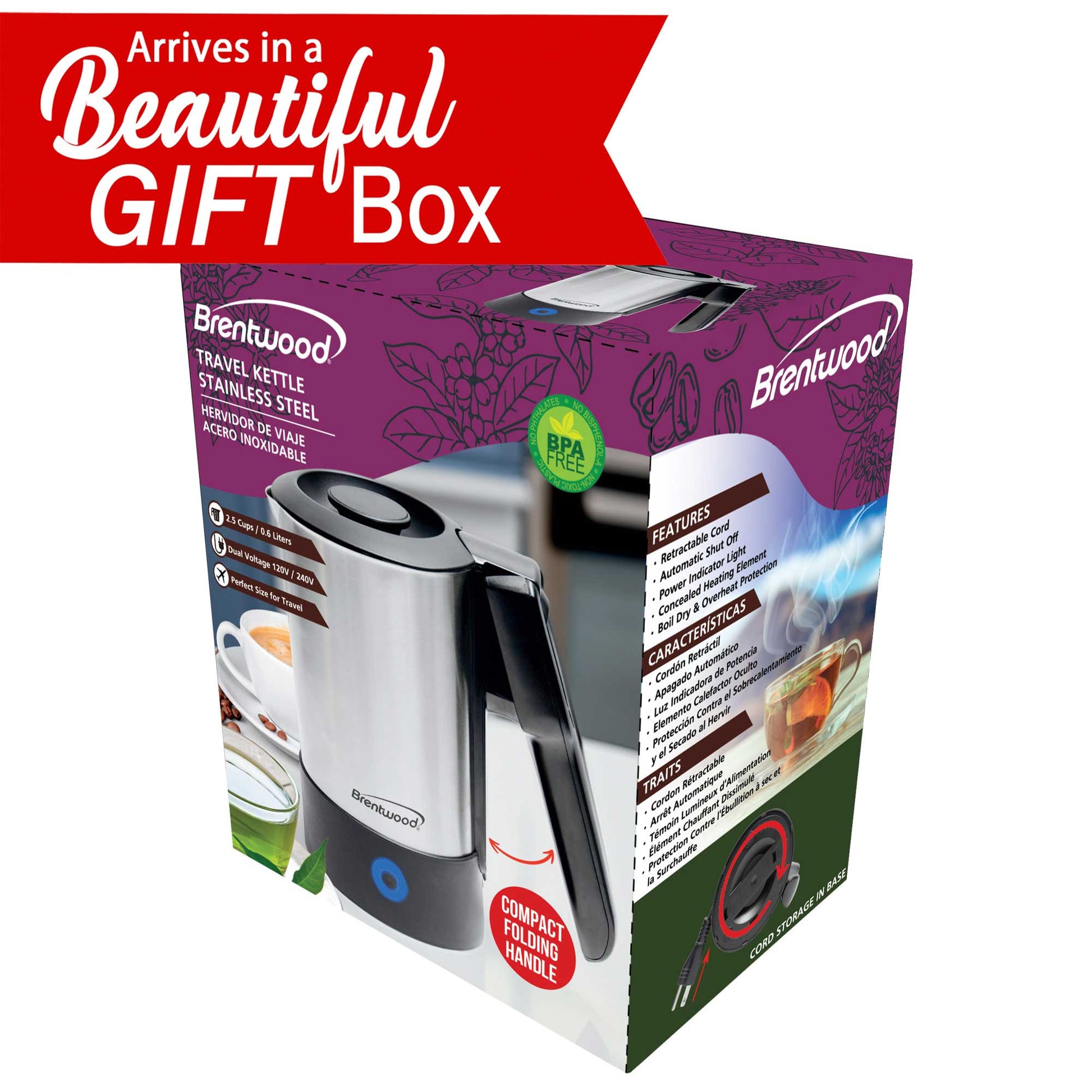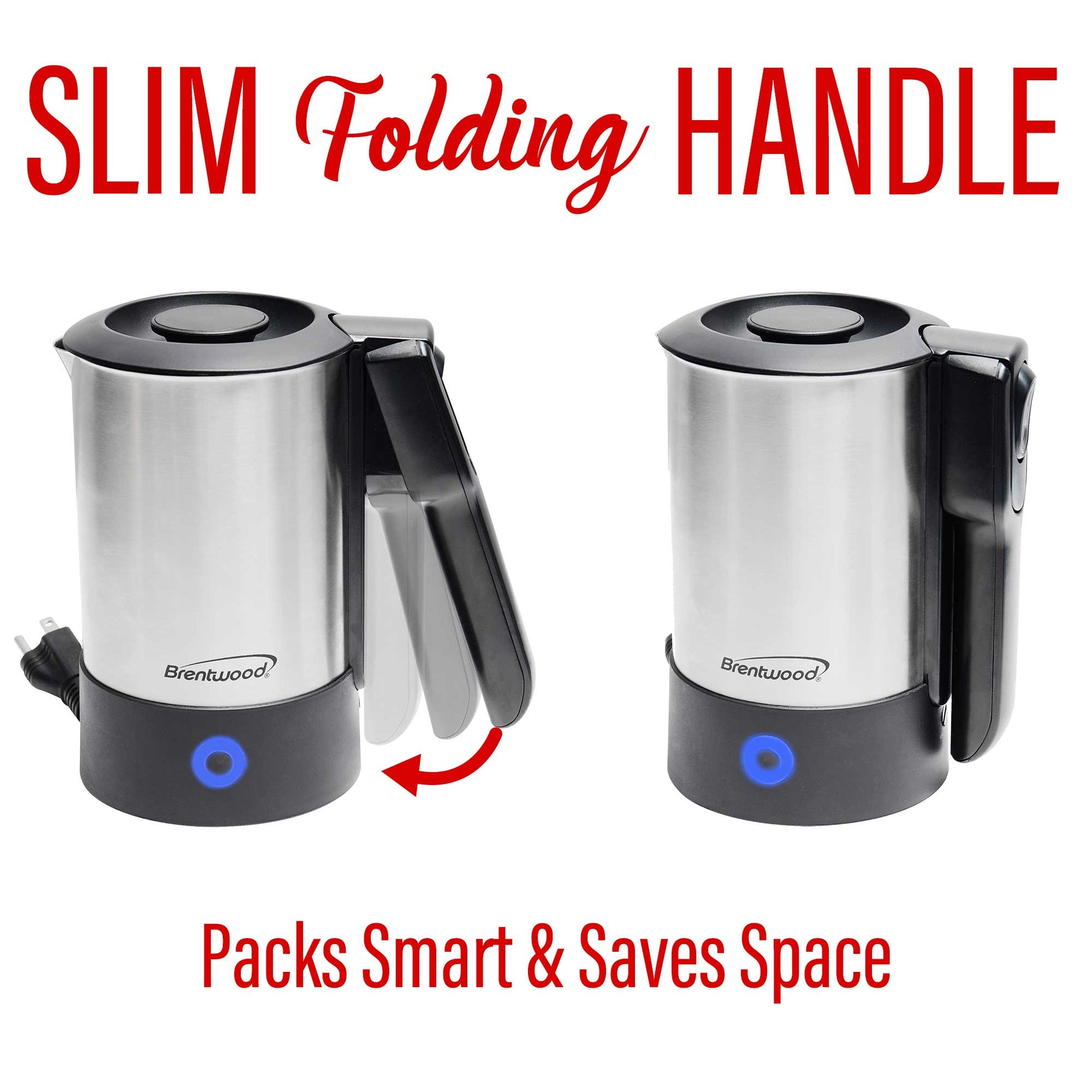 - The Brentwood KT-1506S 20 Ounce Dual Voltage 110-240v Stainless Steel Electric Travel Kettle can be used worldwide thanks to 110 to 240 voltage rating. Boil water faster than a microwave and safer than a stove top kettle. Conveniently make hot tea, French press or pour over coffee, instant oatmeal and more. Our perfect travel kettle has a slim folding handle and a power cord that winds up into the base, keeping your luggage compact and tidy. Full stainless steel interior, concealed heating element and BPA Free parts ensure water is free of impurities. Includes boil dry and overheat protection for added safety. Unit automatically shuts off once water reaches a boil.
