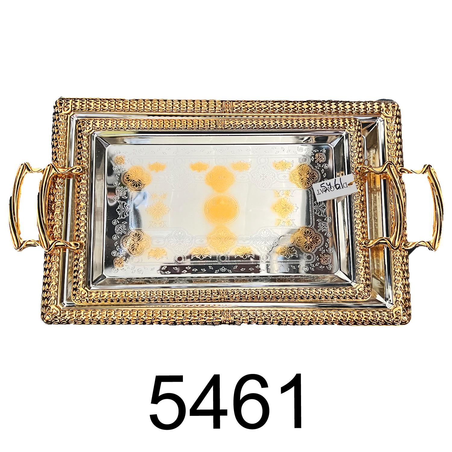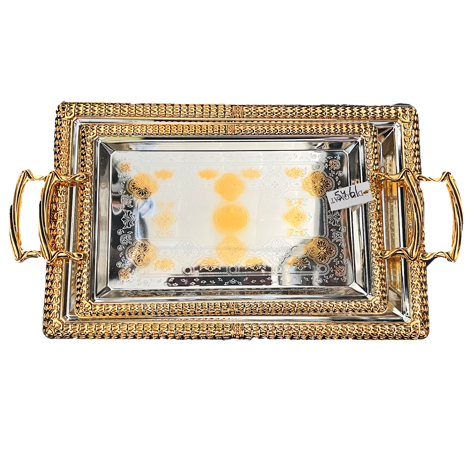 2 PC Turkish Serving Tea Tray Set Gold Handle and Accents Chrome Plated