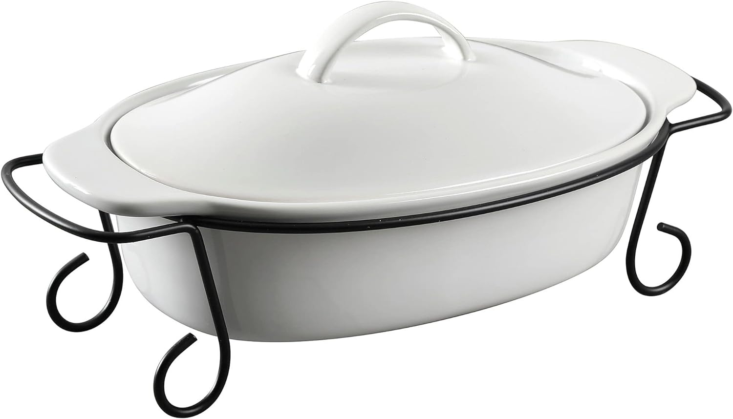 - Beautifully display your culinary creations with the Gibson Elite Gracious Dining 2 Piece Oval Stoneware Bakeware with Lid and Metal Rack. This collection comes with a stoneware baking dish that is both microwave and oven safe which allows you to create pies, cobblers, and other delicious pastries right in the dish! After baking, cool and display your meals with the included metal display rack. The dish can also be put in the dishwasher for easy cleanup!