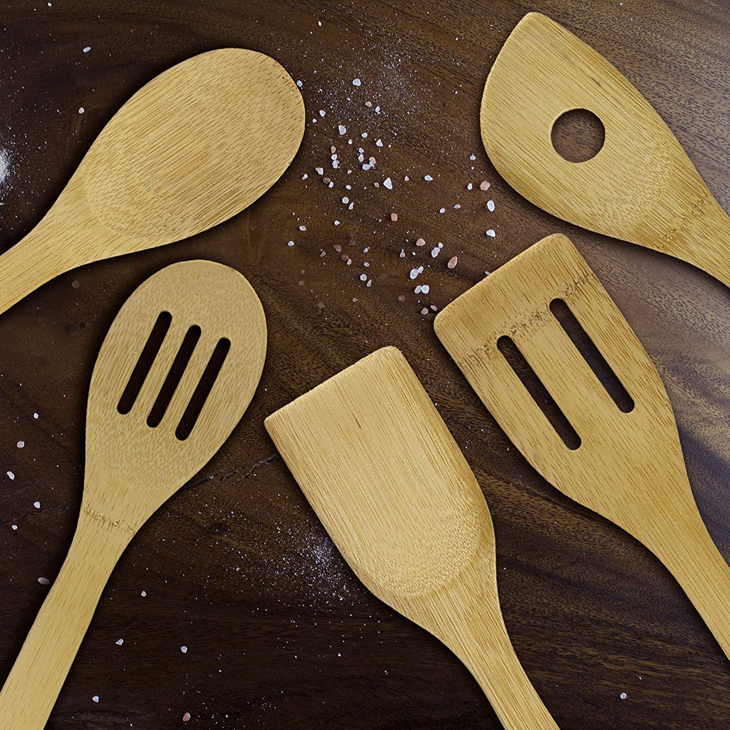- 5 piece set includes a spoon, slotted spoon, spatula, slotted spatula and single hole mixing spoon; a natural alternative to plastic utensils and safe for use with non-stick cookware
