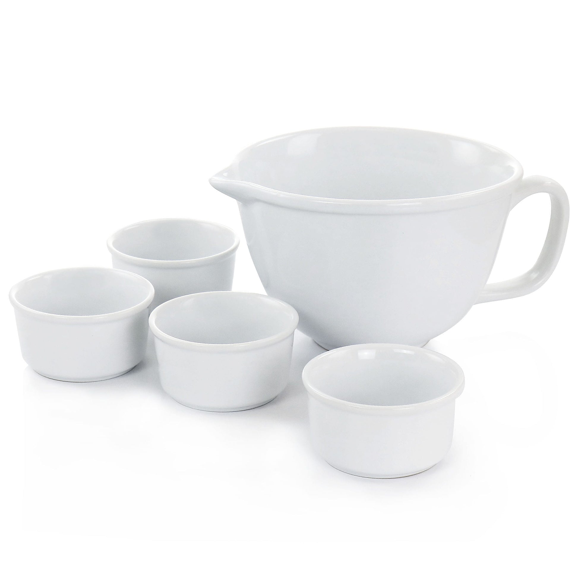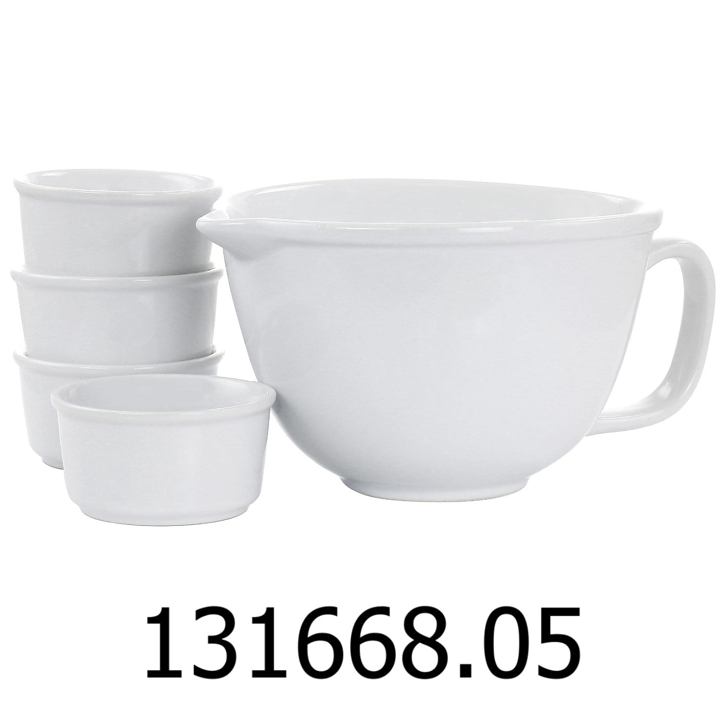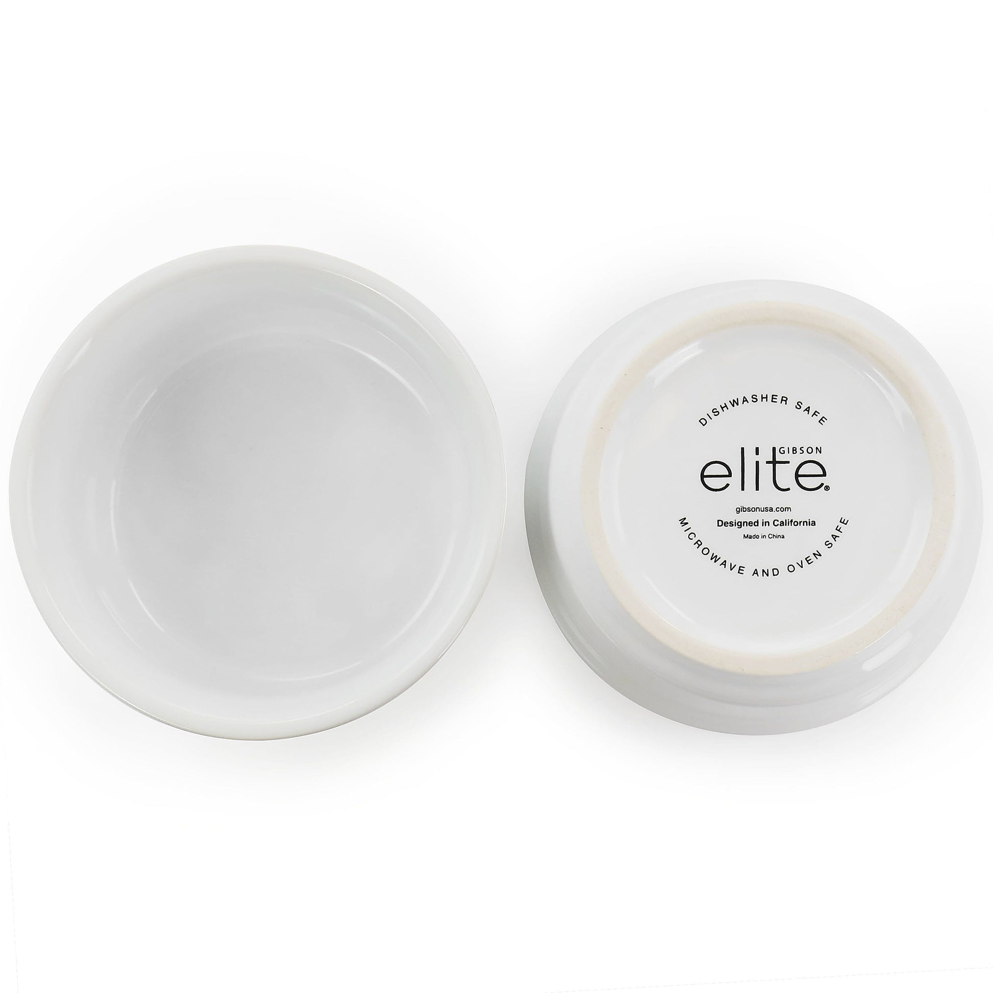 - Part of the Gracious Dining Collection by Gibson Elite, this 5 piece Bakers set is sleek and modern and will go nicely with most kitchen decor. Sophisticated style that brings character and richness to the table, blending seamlessly with a wide array of colors and motifs. This set includes one 2qt batter bowl and 4-8oz matching ramekins. Bake custards, cakes, flans, and a variety of other individual serving dishes with this set and enjoy without having to transfer to a plate!