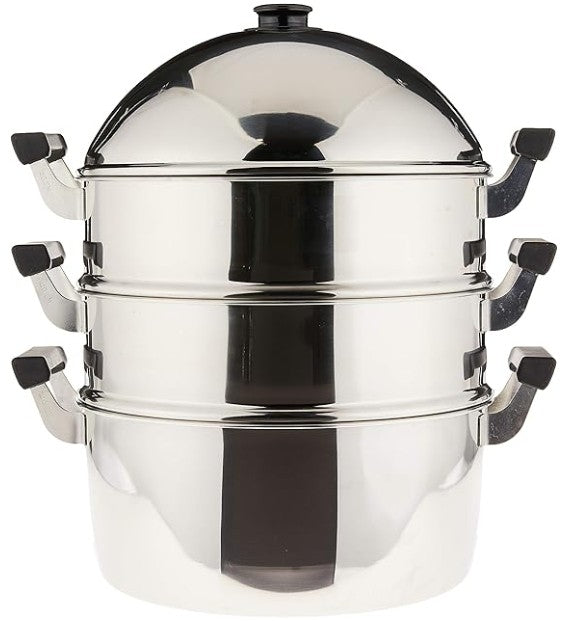 - 50cm diameter with dome lid and multiple tiers for cooking vegetables, seafood, dumplings, and more. Diámetro de 50 cm con tapa de domo y múltiples niveles para cocinar verduras, mariscos, dumplings y más.