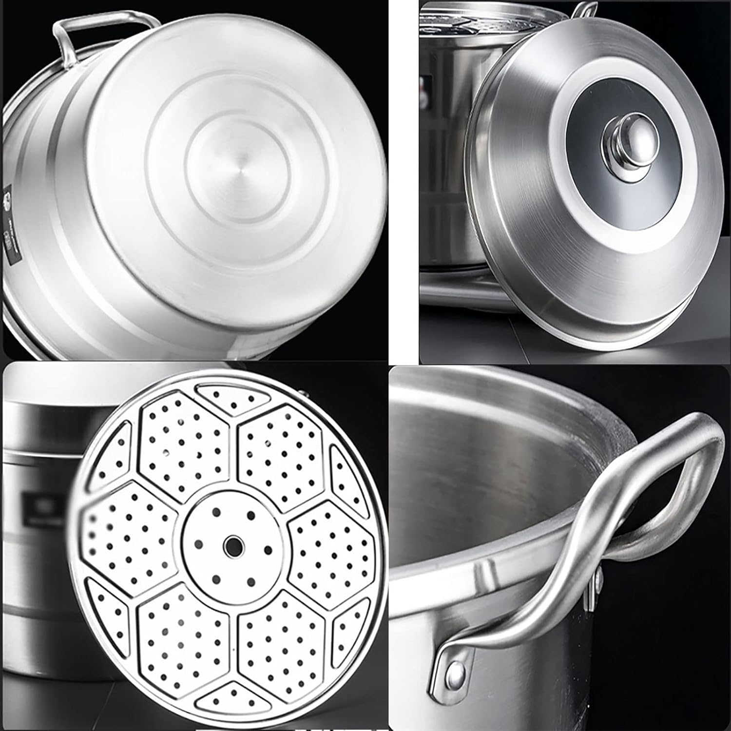 - Material: 201 stainless steel, thickened one-piece steel die-casting, internal and external frosted and polished, visually heightened arched cover, all-steel handle, rivet reinforcement, diversion steamer.