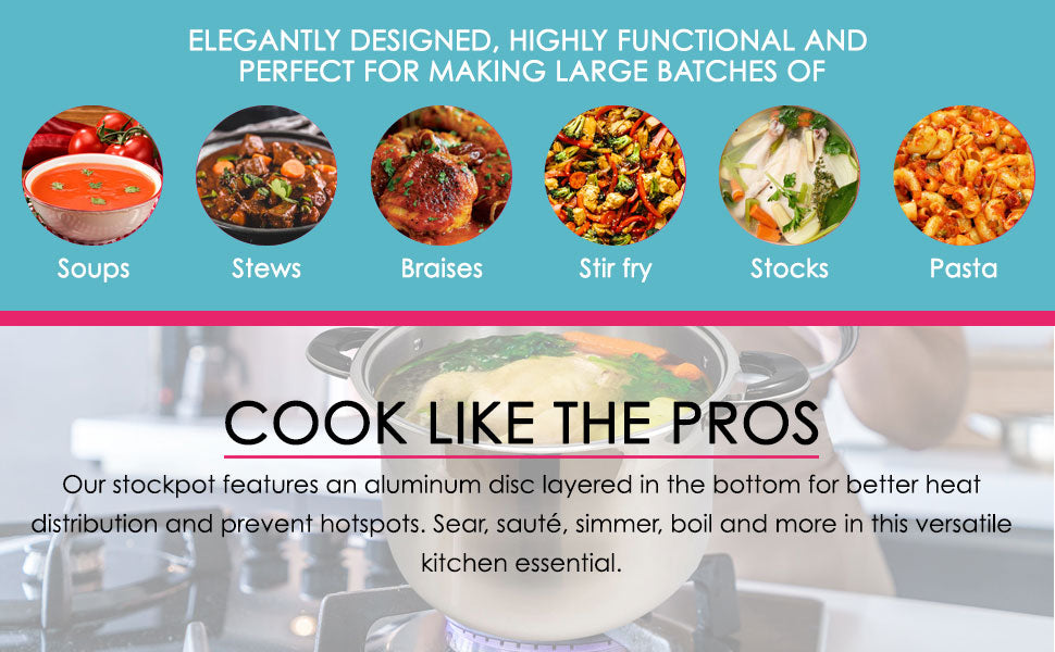 - EASY CARE: With no nonstick surface to maintain, the stockpot is dishwasher safe and will last for many years of service. Perfect for the home, catering or for the professional chef.