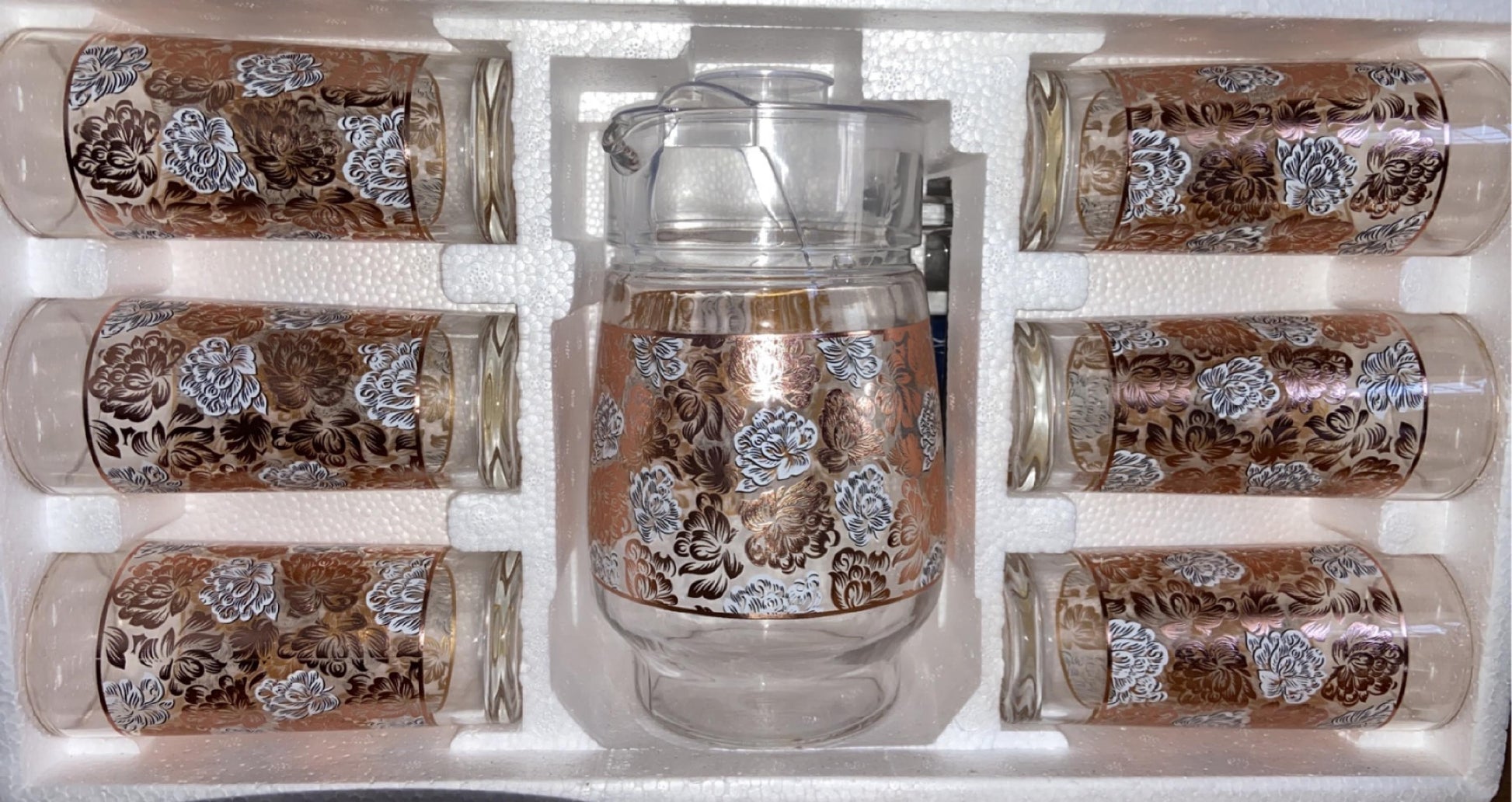 7 PC Rose Gold Peony Design Set with Glass Pitcher and Cups