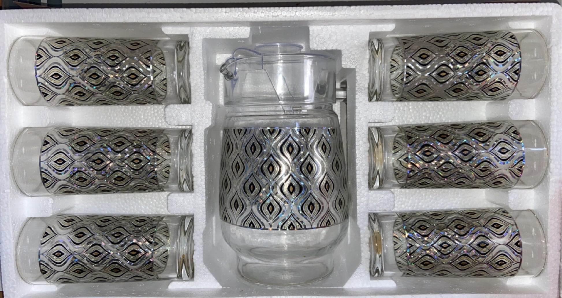 7 PC Silver And Black Peacock Tail Design Set with Glass Pitcher and Cups