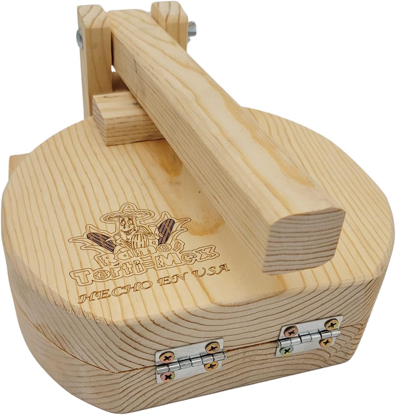 - This Traditional Tortilla press is made out of beautiful Hard Pine Wood, it makes a perfect decoration piece, and is very easy to clean being that it doesn't absorb or stain like other wood presses. This Press will allow you to flatten balls of dough into thin larger tortillas, excellent for larger sized fresh Corn Tortillas. Made from solid hard wood, it's hard and long lasting giving tortillas the most traditional taste. Weather you enjoy preparing and making tortillas or not, the press will make a wonderful conversation starter/ display piece in your kitchen. Perfect especially for Corn tortillas, which are easy to make at home, especially if you use a tortilla press (instead of a rolling pin) to flatten the balls of masa, or dough, into disks. This press is made from high quality Pinewoods that give it a unique character and durability. Wood, color and grain patterns may vary slightly with each press. The press has been treated with several coats of food grade mineral oils and beeswax. This is a truly well designed piece of kitchen equipment made out of durable and long lasting materials. Avoid hassle, save time, and save money and order yours today! Enjoy your beautifully made and delicious fresh Home-made Corn Tortillas with every use!