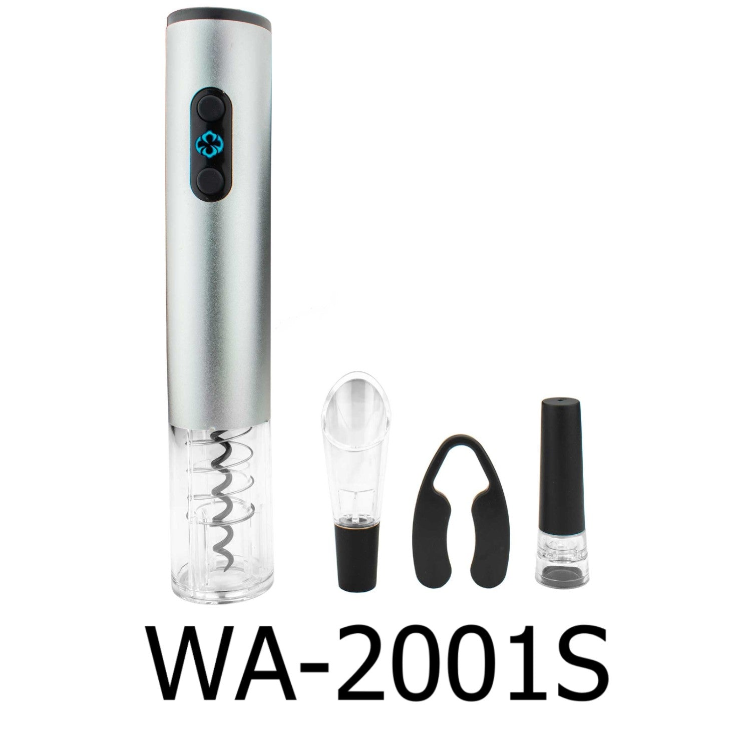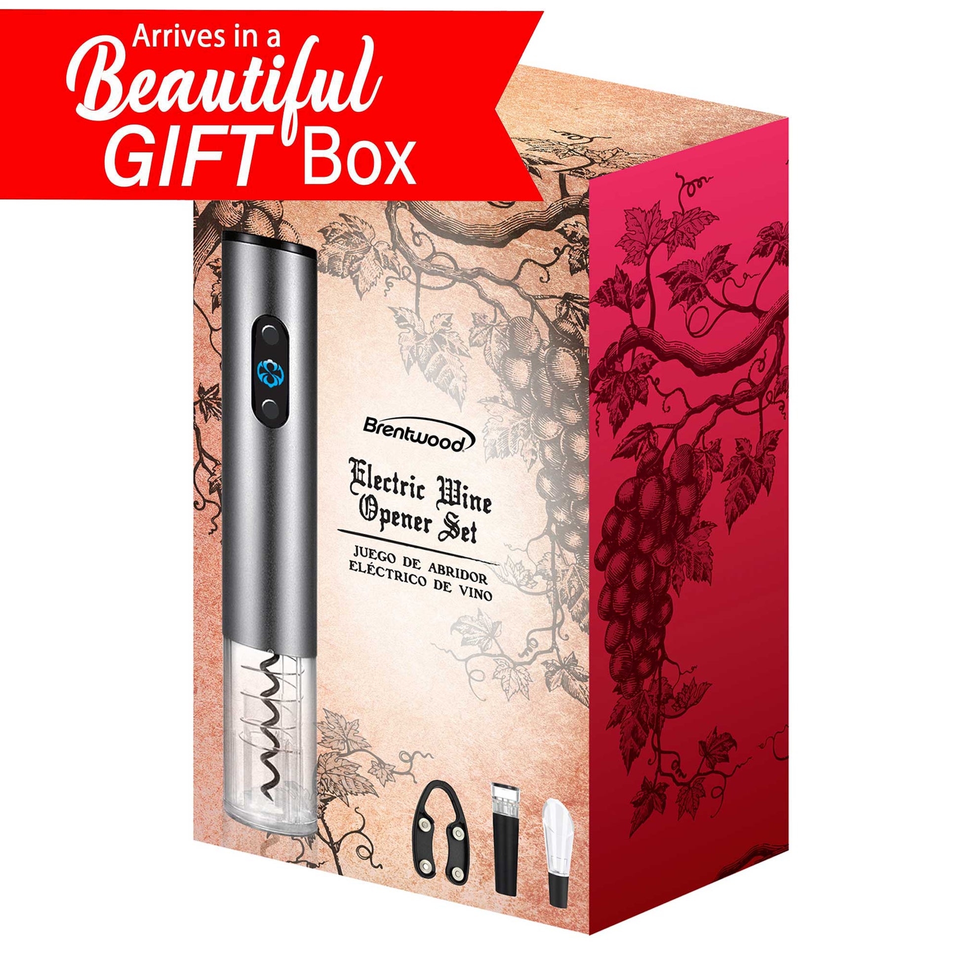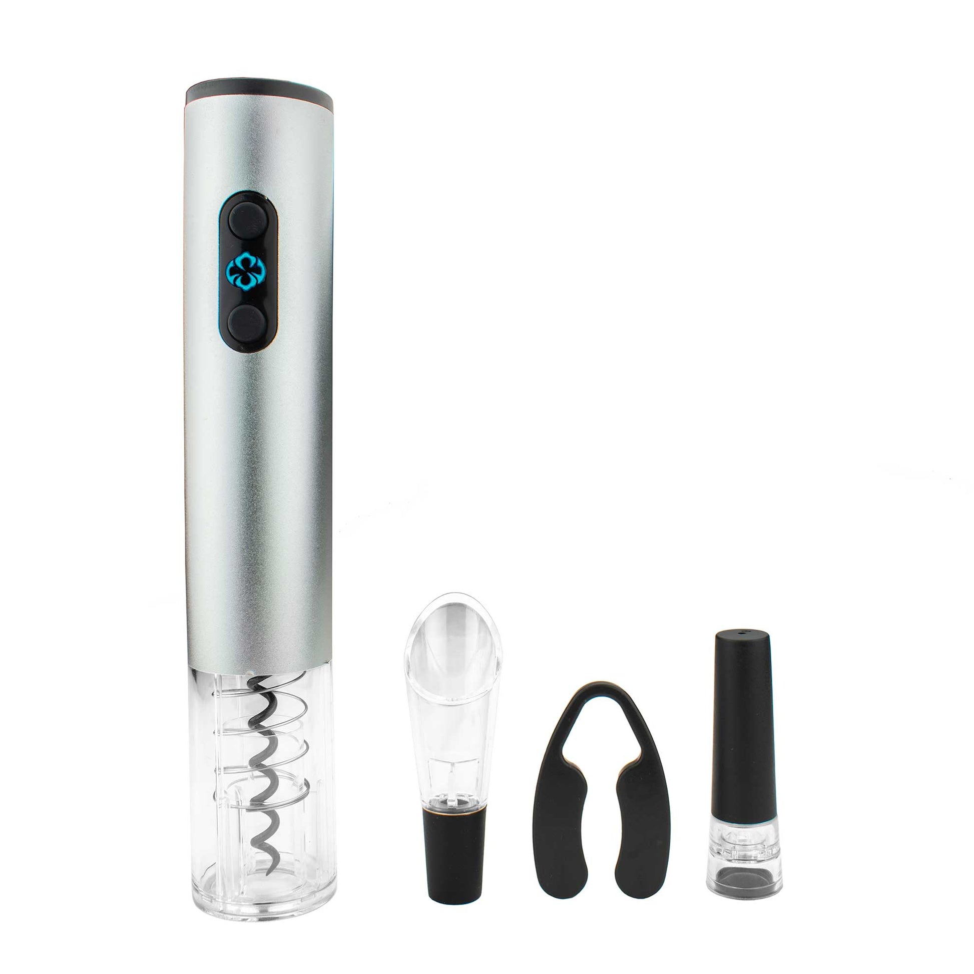 - Use the Brentwood WA-2001S Electric Wine Bottle Opener with Foil Cutter, Vacuum Stopper, and Aerator Pourer to enhance your wine tasting experience. Seamlessly cut foil tops with the 4 blade precision foil cutter. Effortlessly remove a cork in just 4 seconds with the push of a button. Impressive blue LED power light indicator illuminates as you remove a cork. Simply press the reverse button to release the cork. The screw is safely covered by a plastic housing reducing chances of accidents. Unlock the most desirable flavors using the wine aerator, removing unwanted compounds like sulfites and ethanol. Keep your favorite bottles of wine fresh with the included vacuum seal stopper. Our electric wine bottle opener conveniently operates with 4 commonly found AA batteries. Sleek silver color adds a sophisticated aesthetic to your kitchen.