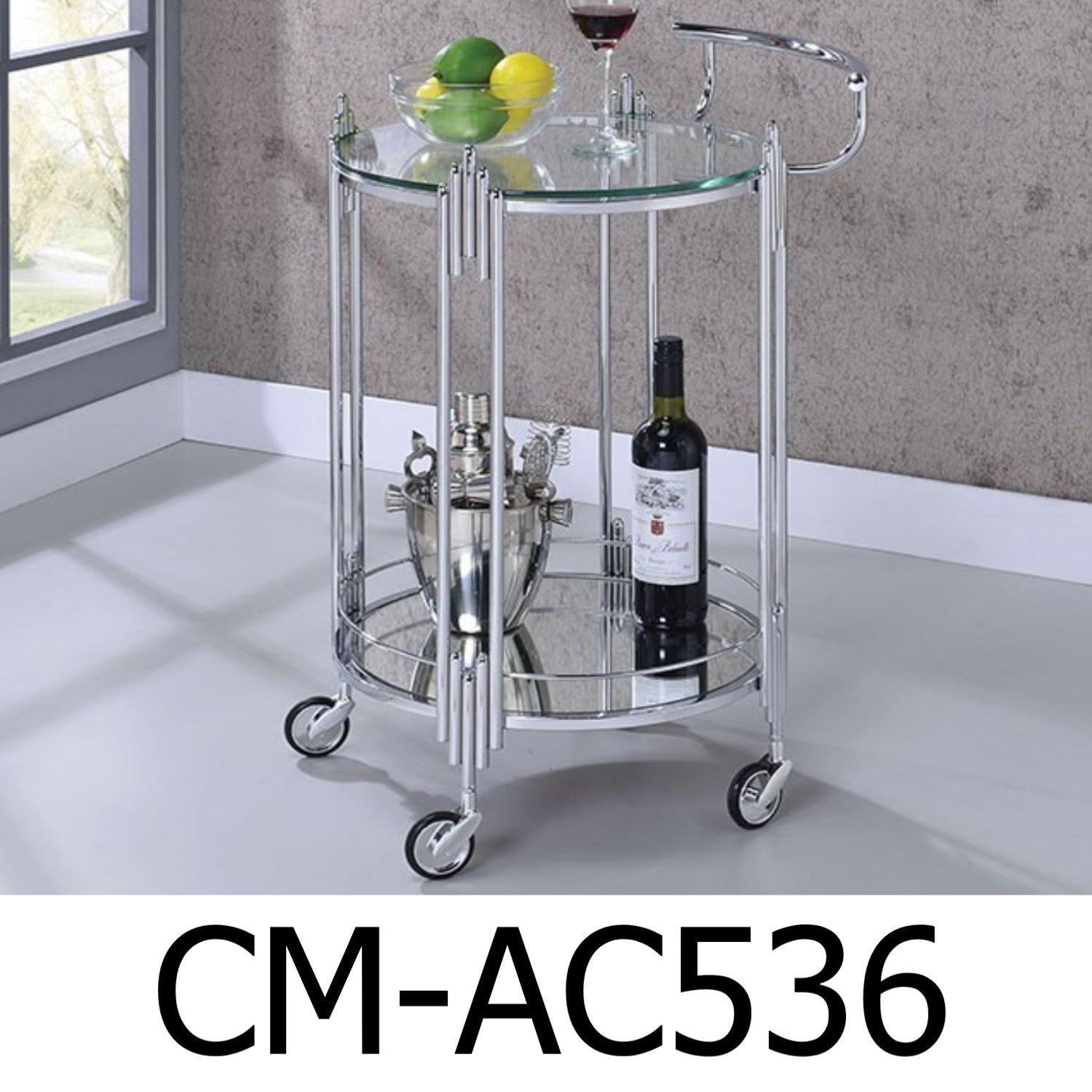 Serve in style with this round chrome cart with caster wheels and a 5mm mirror bottom shelf.