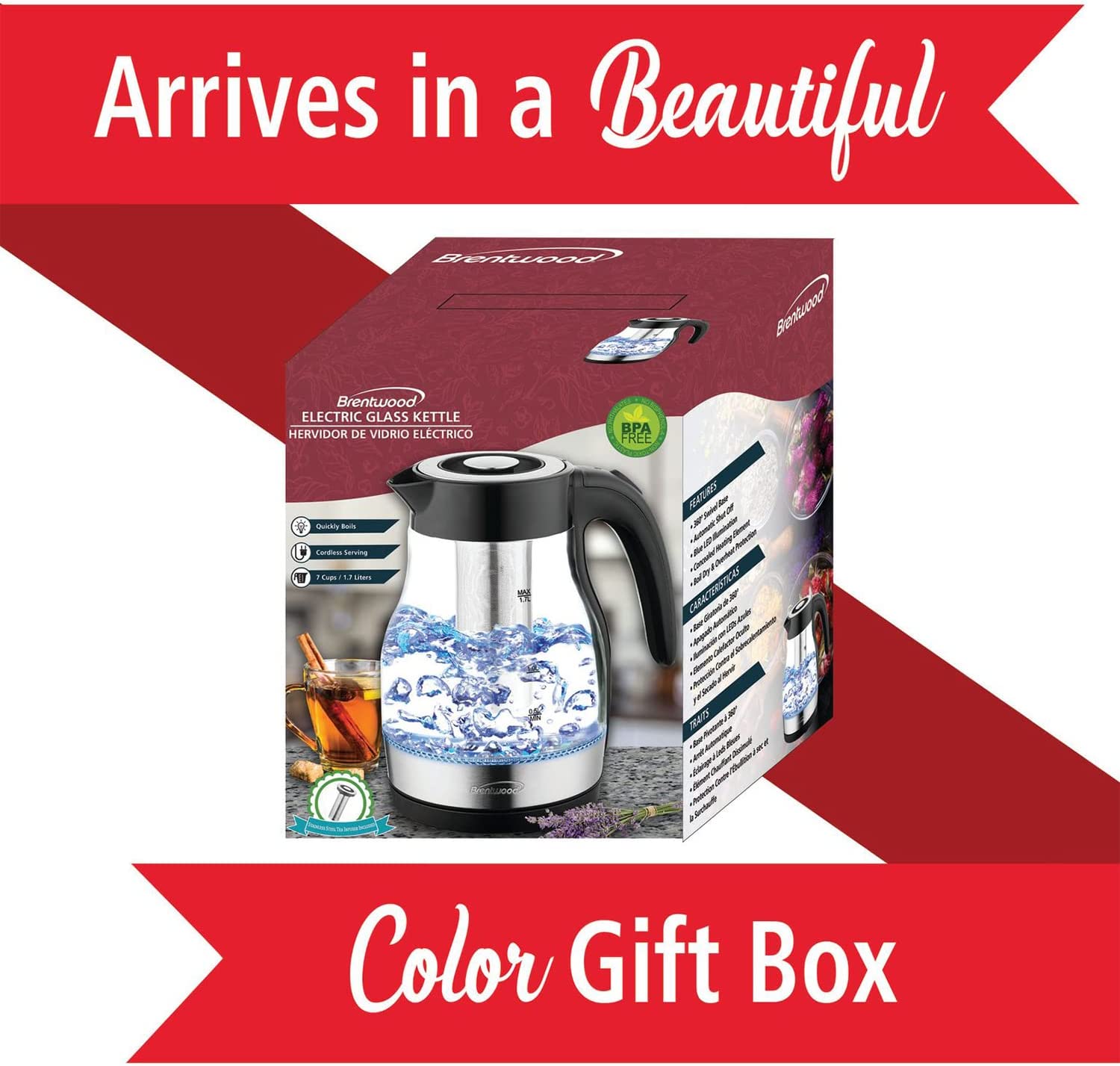 - The Brentwood KT-1962BK 1.7L Cordless Glass Electric Kettle with Tea Infuser, Black boils water faster than a microwave and safer than a stove top kettle. Water boils within minutes with a single push of a button. Gorgeous blue LED lights up the glass kettle while boiling. Cordless kettle lifts off the 360 swivel base for easy filling and pouring. Conveniently make hot tea, French press or pour over coffee, instant oatmeal and more. Full glass kettle with food grade stainless steel tea infuser, concealed heating element and BPA Free parts keeps water free of impurities. Includes boil dry and overheat protection for added safety. Unit automatically shuts off once water reaches a boil.
