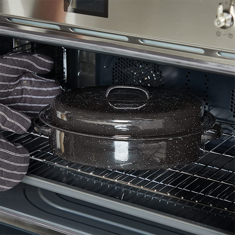 - SELF-BASTING LID – dimpled self-basting lid traps moisture and allows juices to drip back down into the roast to add extra flavor