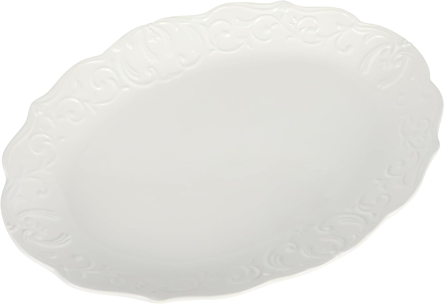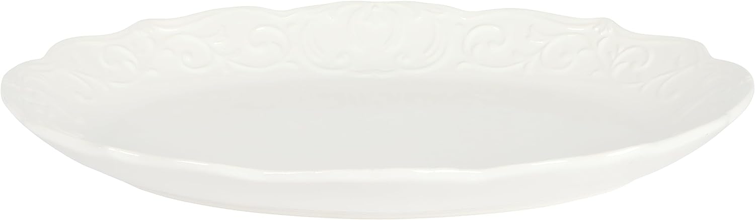 - The art of excellent entertaining begins with impressive presentations. The Gibson Home Bountiful 18-inch Oval Ceramic Serving Platter celebrates special seasons or anytime moments by serving the main course, side dishes, or desserts with grace and style. Embossed designs decorate the ruffled edges to draw the eye to the delicious culinary masterpieces for any occasion. Add this classic piece of whiteware to your wish list or wedding registry or give it as a gift to family and friends.