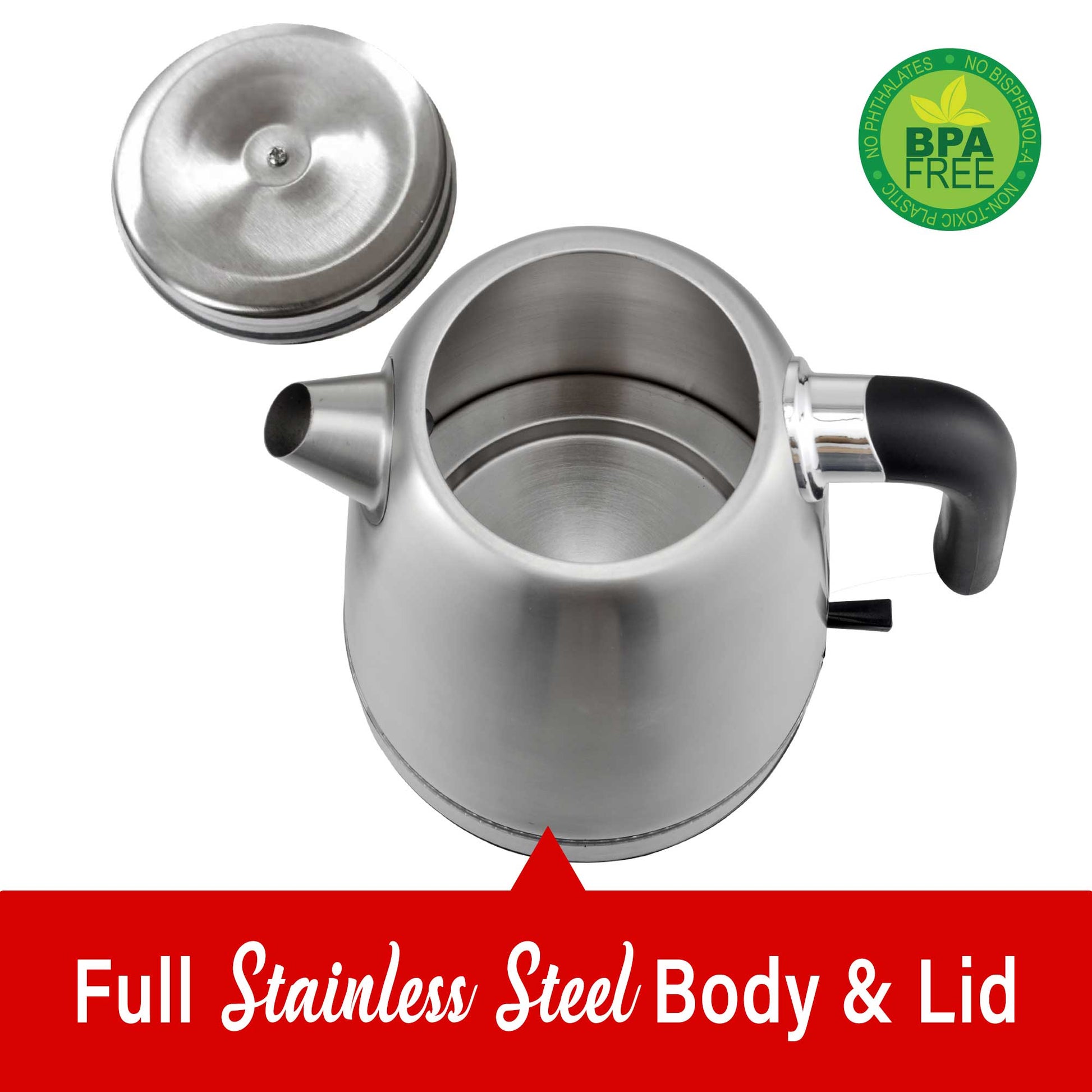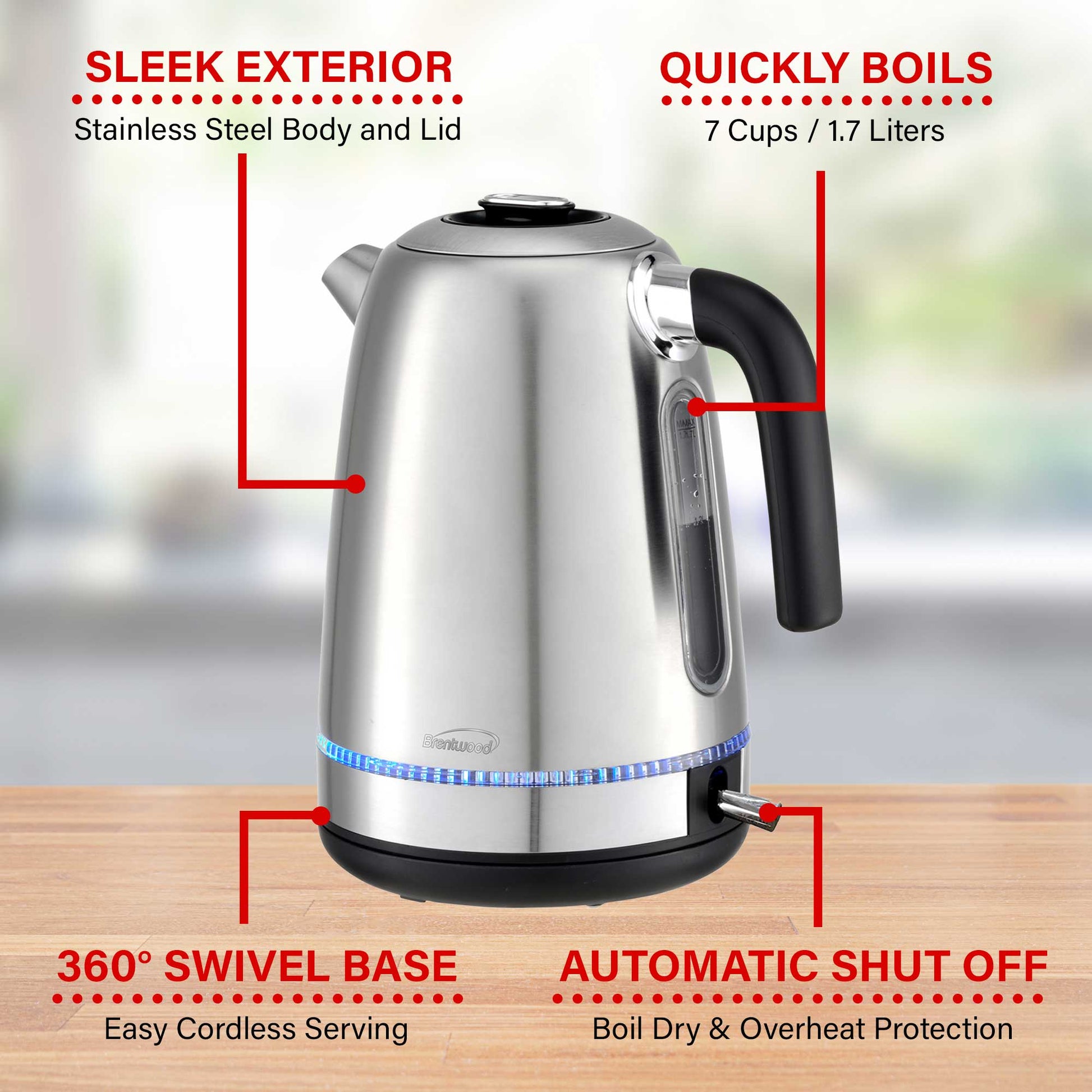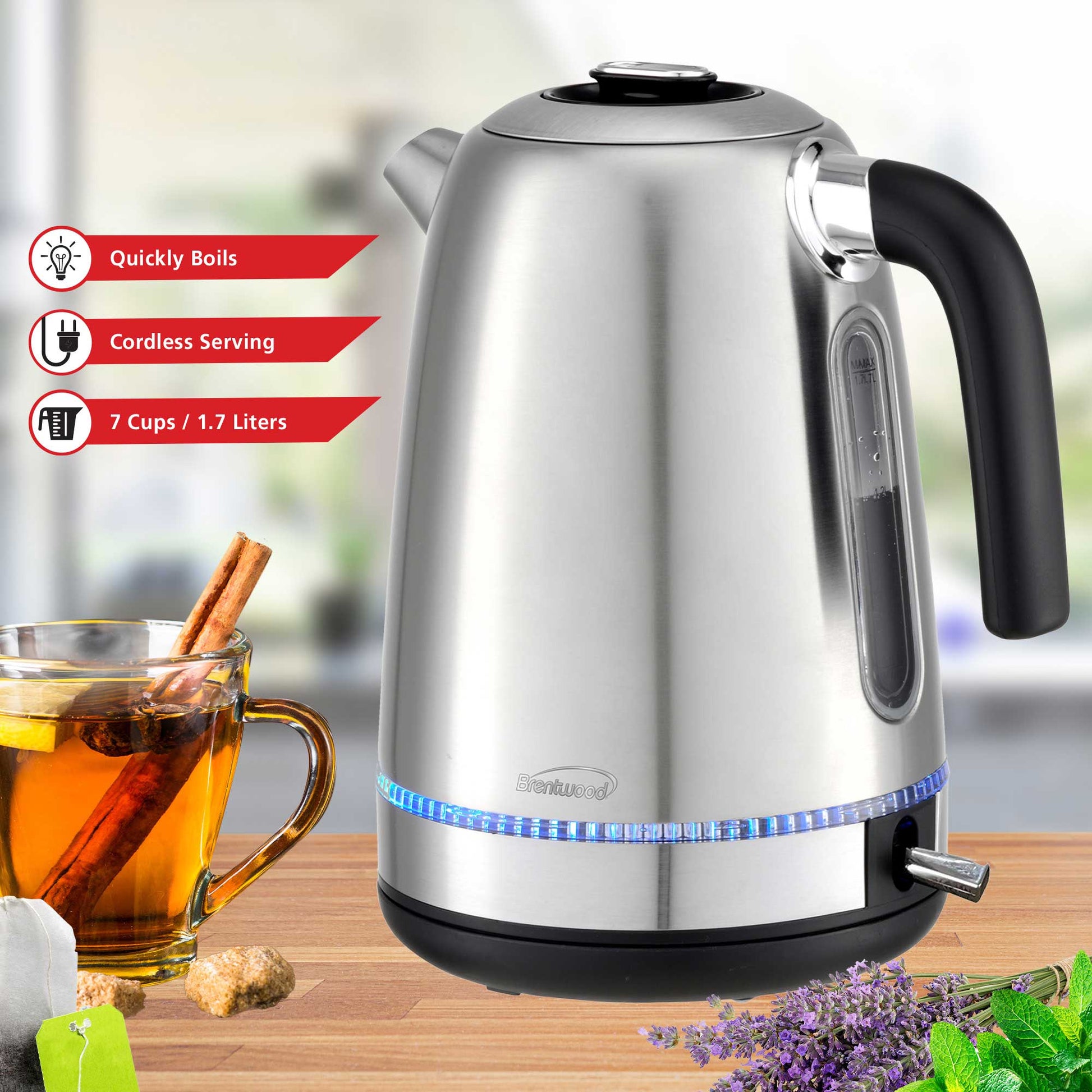 - The powerful 1500 watt Brentwood KT-1792S 1500W 1.7L Cordless Electric Stainless Steel Kettle boils water faster than a microwave and safer than a stove top kettle. Water boils within minutes with a single push of a button. Gorgeous blue LED lights up the glass kettle while boiling. Cordless kettle lifts off the 360 swivel base for easy filling and pouring. Conveniently make hot tea, French press or pour over coffee, instant oatmeal and more. Full glass kettle, concealed heating element and BPA Free parts keeps water free of impurities. Includes boil dry and overheat protection for added safety. Unit automatically shuts off once water reaches a boil.