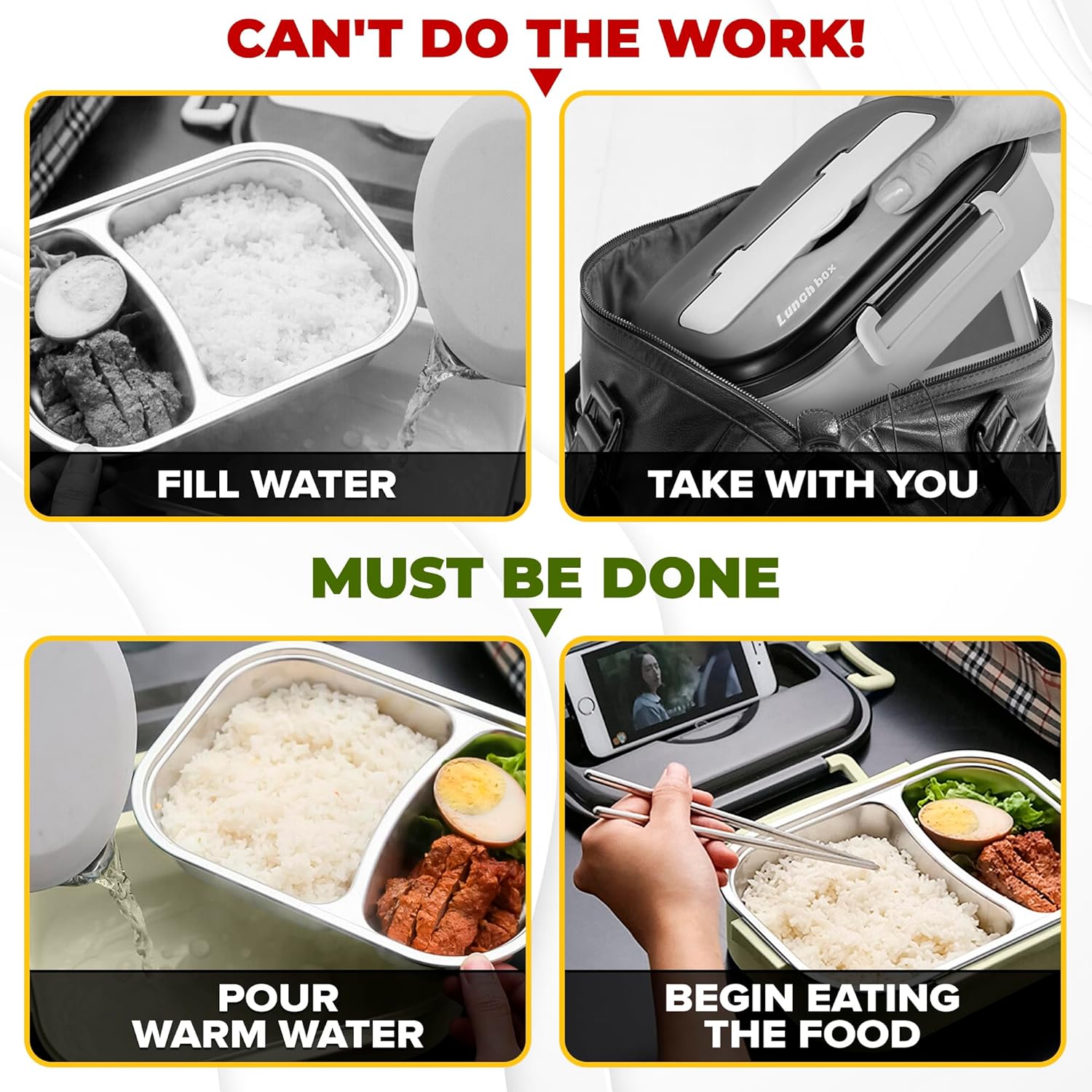 - CAUTION⚠️: THIS ITEM IS NOT INTENDED FOR USE BY CHILDREN 12 AND UNDER ⚠️ YOU DON'T NEED TO FILL THE CONTAINER WITH WATER AND CARRY IT WITH YOU. ONLY POUR HOT WATER INTO IT JUST BEFORE EATING TO KEEP YOUR MEAL WARM! ⚠️THESE ADULT LUNCHBO DOESN'T KEEP THE FOOD WARM BUT IT CAN USED HEAT THE FOOD. ⚠️PLACE IT TABLE WHILE OPENING THE BENTO LUNCH BOX FOR GIRLS TO AVOID SPILLS.