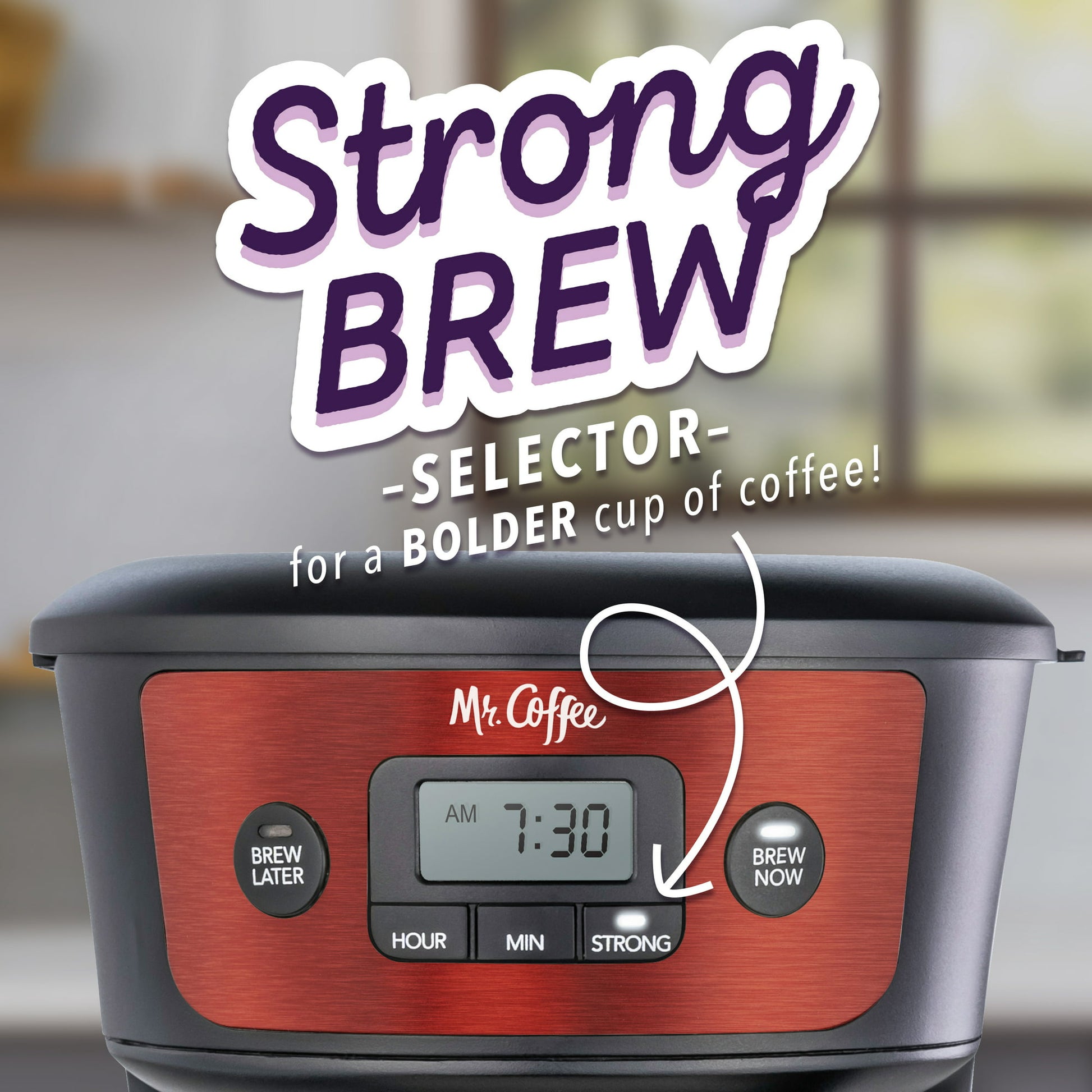 - Enjoy delicious, bold-tasting coffee made simple with the new Mr. Coffee 12-Cup Programmable Coffee Maker with Strong Brew Selector. Brew your coffee as bold as you like it with the Strong Brew Selector—you can choose to brew a bolder cup of coffee if that's what you'd like, with the touch of a button. The coffee maker also features intuitive Brew Later programming that makes it easy to schedule brewing ahead of time, so you can wake up to the smell of freshly made coffee. This updated design also includes a Grab-a-Cup Auto Pause, so you can pour a cup of coffee before brewing is finished. Plus, the 4-Hour Auto-Shutoff feature automatically turns off the coffee maker so you don't have to. Just sit back, sip, and enjoy great coffee just the way you like it.