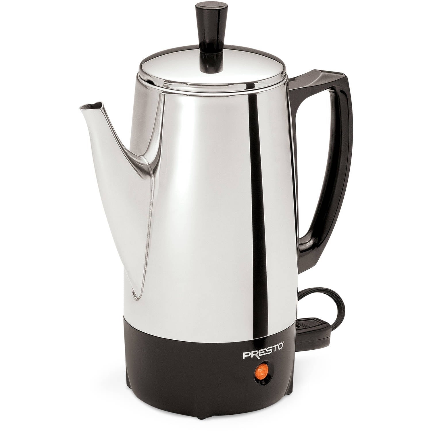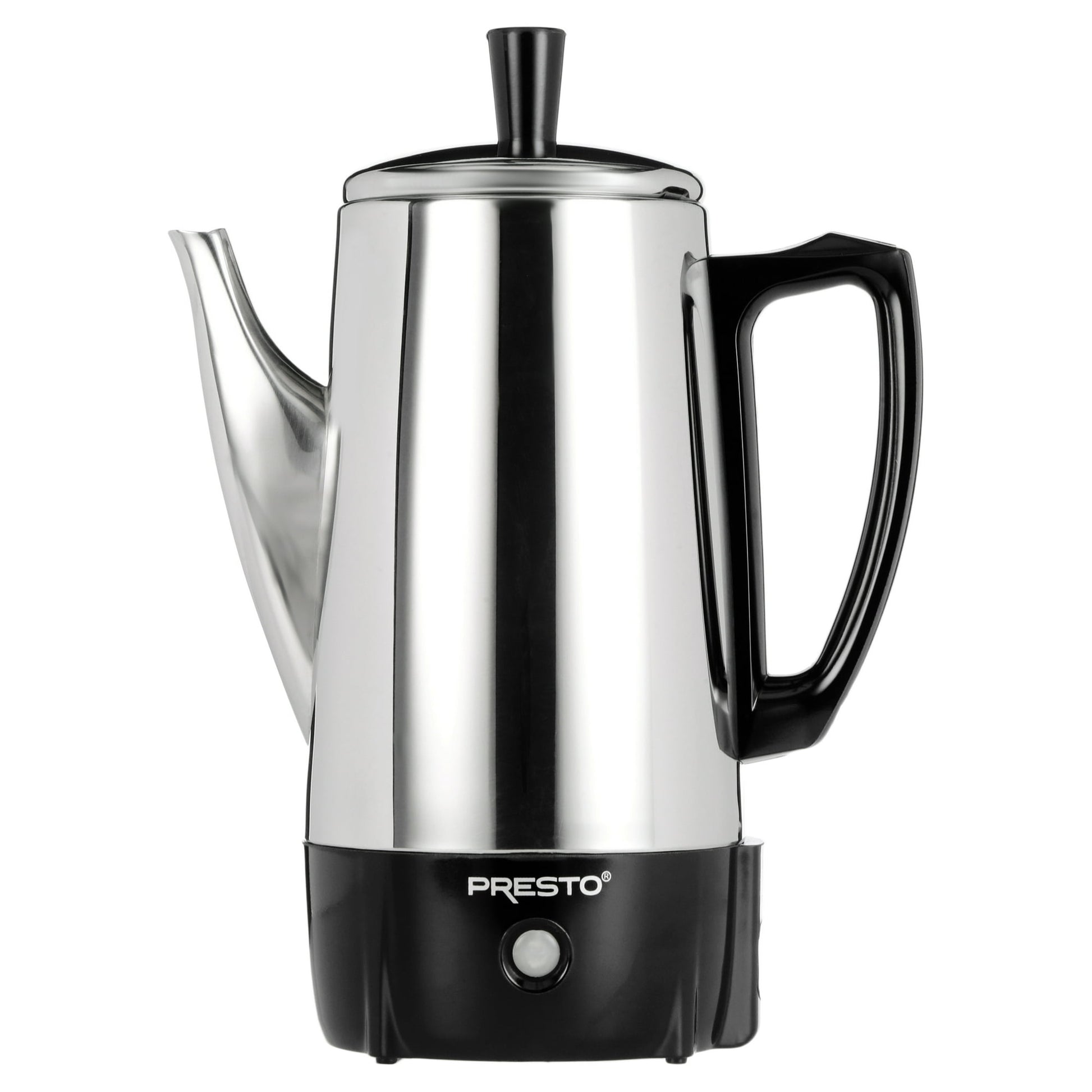 - Brews great coffee, hot and rich! Enjoy a refreshing brew anytime with the Presto® 6-Cup Capacity Stainless Steel Coffee Maker #02822. It makes two to six cups of delicious-tasting coffee as fast as a cup a minute, then keeps it piping hot automatically and ready to serve. This Presto® coffee maker is made of luxurious stainless steel, including the filter basket and perk tube, for easy cleaning and lasting beauty. The signal light indicates when the coffee is ready to serve. The traditional design features an easy-pour spout and stay-cool handle for elegant coffee service anytime.