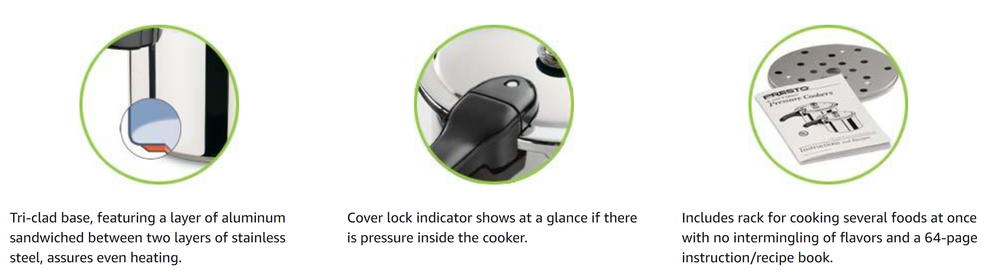 The smart choice for healthy, favorite meals, fast and easy. Cooks 3 to 10 times faster than ordinary cooking methods - even faster than a microwave for many foods. Chicken, fish, meat and vegetables cook to perfection fast. Helps tenderize economical cuts of meat. Works on regular and smooth-top ranges. Cover lock indicator shows when there is pressure inside the cooker and prevents the cover from being removed until pressure is safely reduced. Includes a special rack for cooking several foods at once with no intermingling of flavors. Dishwasher safe for easy cleaning. Liquid capacity: 8 quarts (7.6 liters).