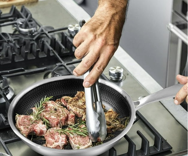 - 18/8 stainless steel top layer, and intermediate layer of aluminium for enhanced thermal conductivity and rapid, even heat and distribution over the entire surface of the pan. Capa superior de acero inoxidable 18/8, y capa intermedia de aluminio para mejorar la conductividad térmica y una distribución de calor rápida y uniforme sobre toda la superficie de la sartén.