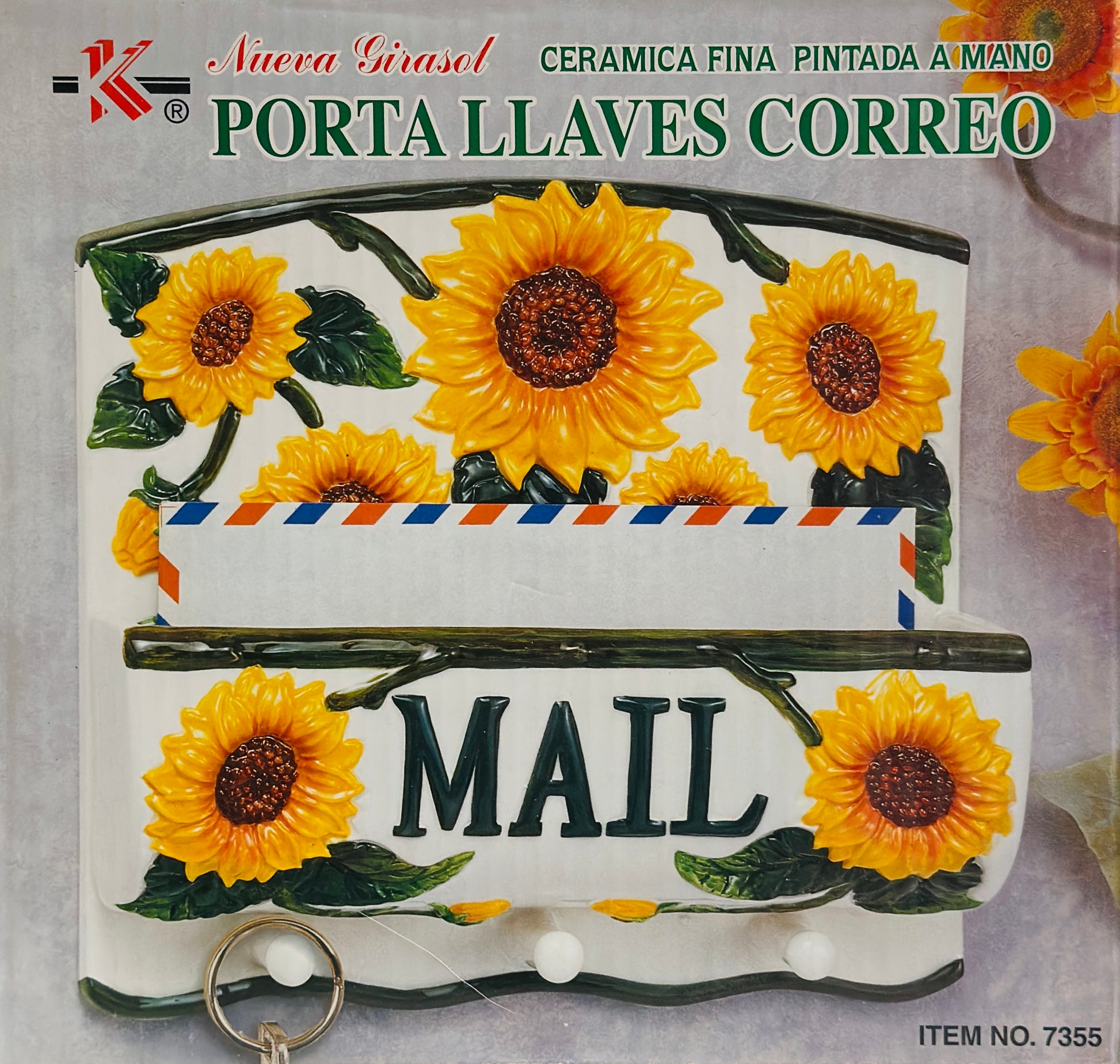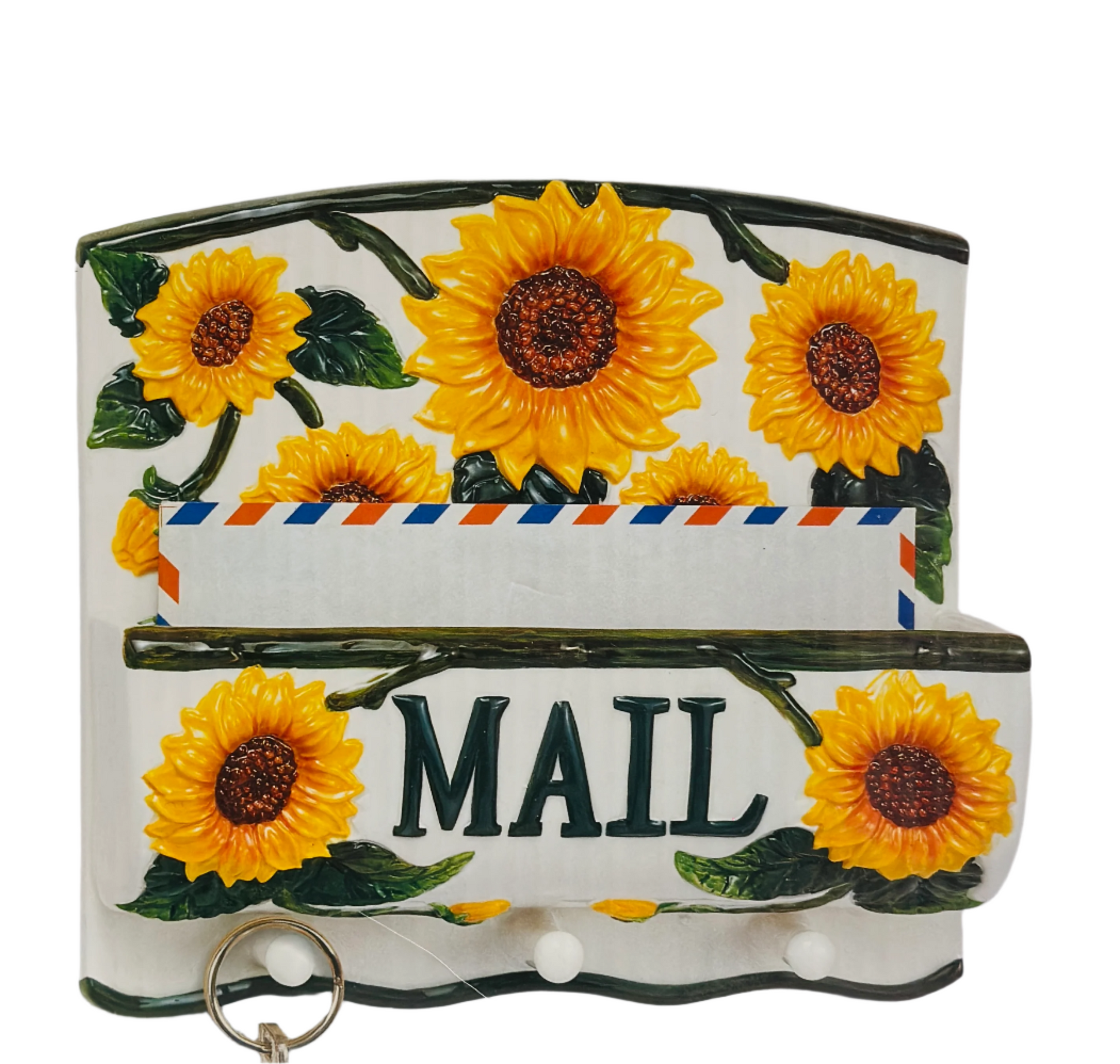 - Spruce up your decor with this County Sunflower hand-painted kitchen and tabletop collection. This truly thrilling beauty features large sunflowers and green leaves softly blending with brown, yellow and orange tones. A great way to organize your mail and your keys, the three-dimensional design is uniquely finished on a glazed white ceramic background.
