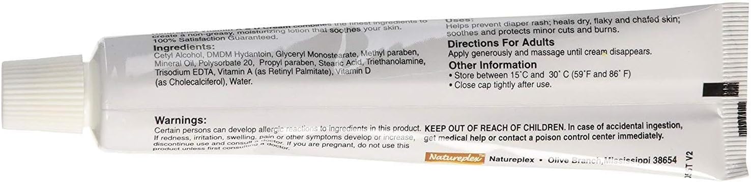- Ingredients: Purified water, stearic acid, cetyl alcohol, glyceryl stearate, mineral oil, triethanolamine, DMDM hydantoin, methylparaben, trisodium EDTA, propylparaben, vitamin A (as retinyl palmitate), vitamin D (as cholecalciferol), polysorbate 20Natureplex Vitamin A & D Cream combines the finest ingredients to create a non-greasy, moisturizer that helps soothe dry, flaky skin.